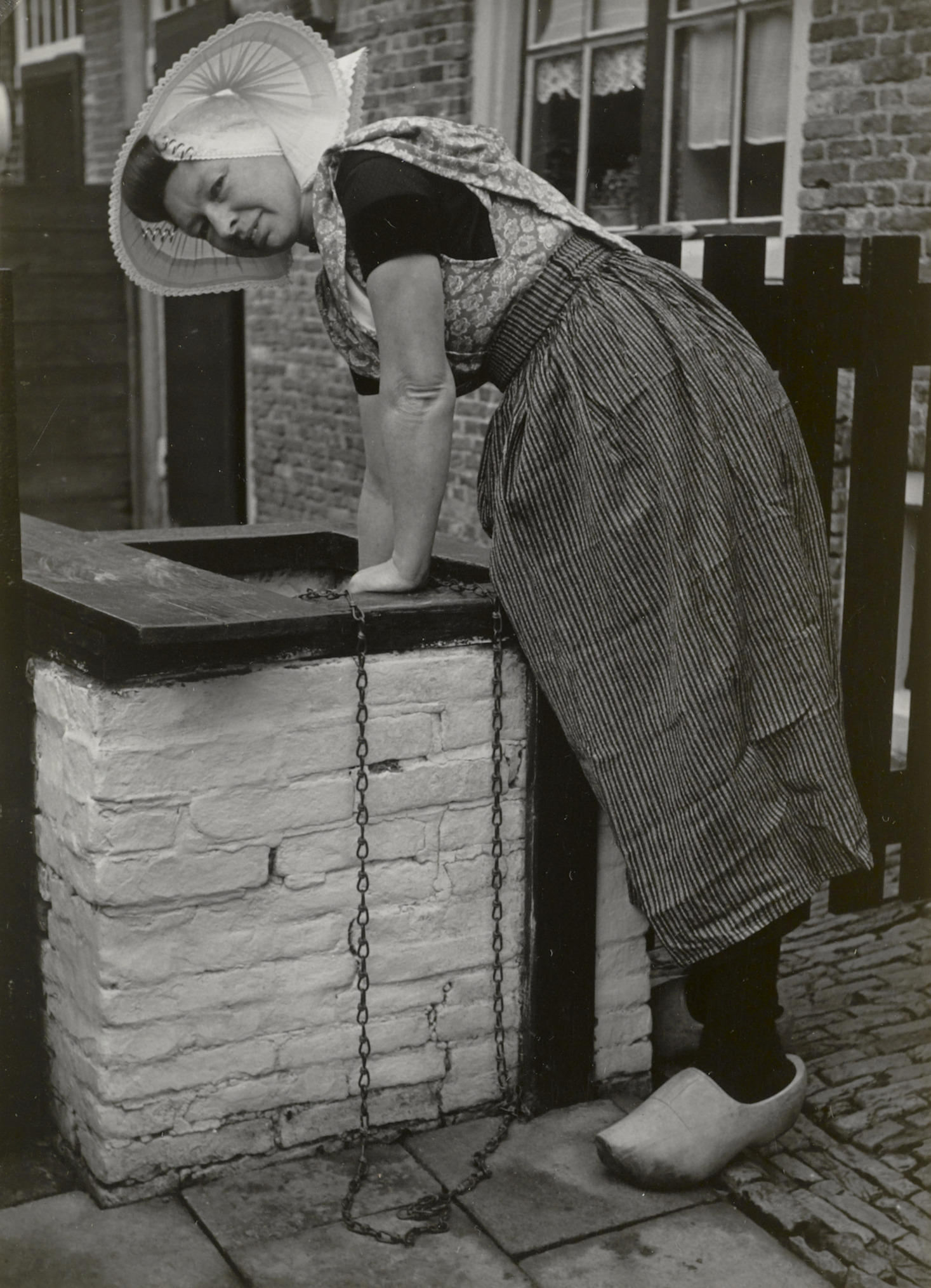 Elizabeth Baas in Nieuwlandse dracht, 1950 (zwart-wit foto)