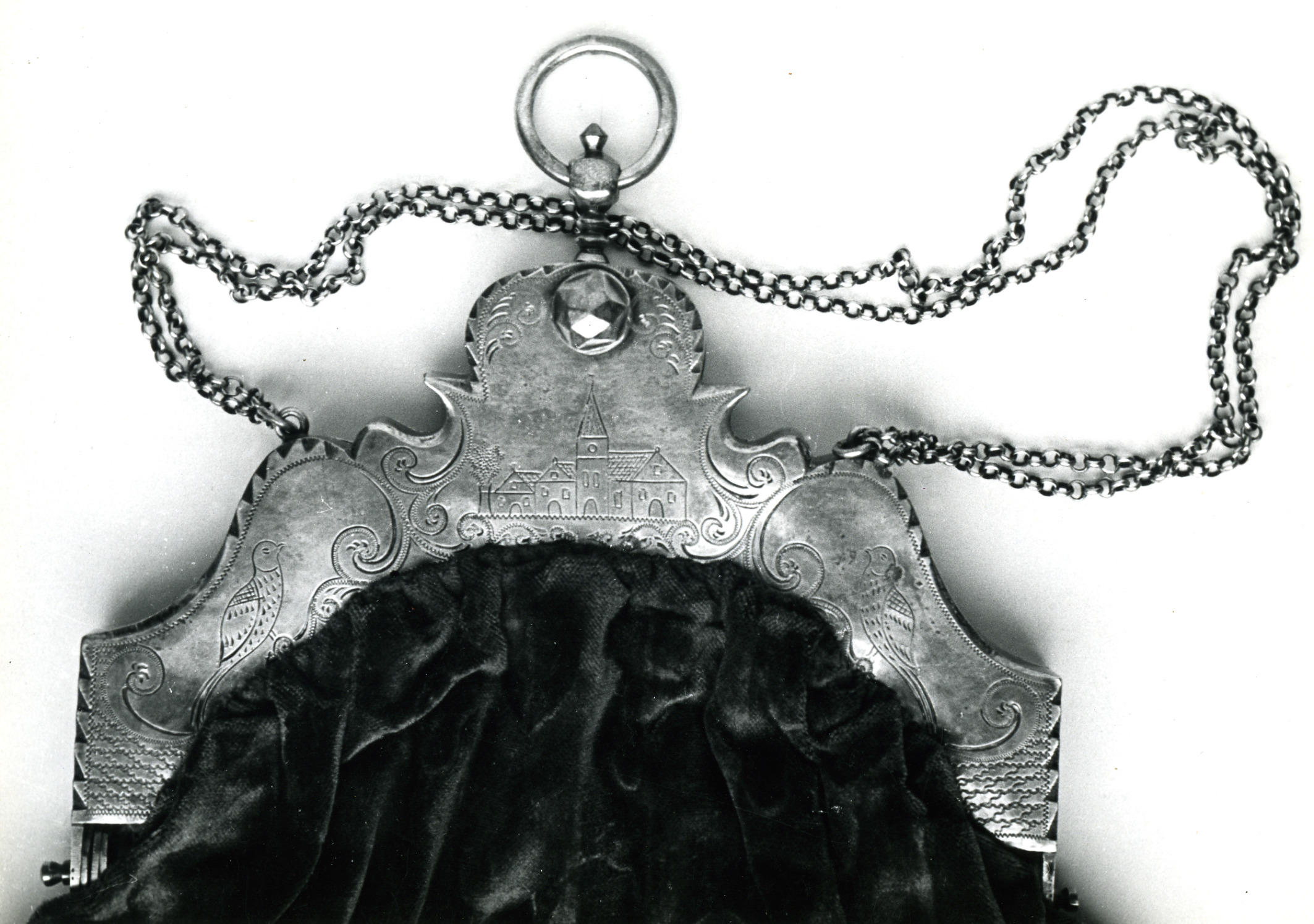 Beugeltas met zilveren beugel, vermaakt tot handtas door de verwijdering van de rokhaak en de toevoeging van een zilveren jasseronketting. De beugeltas is gemaakt rond 1915-1920 en eigendom van een vrouw uit Nieuwland.