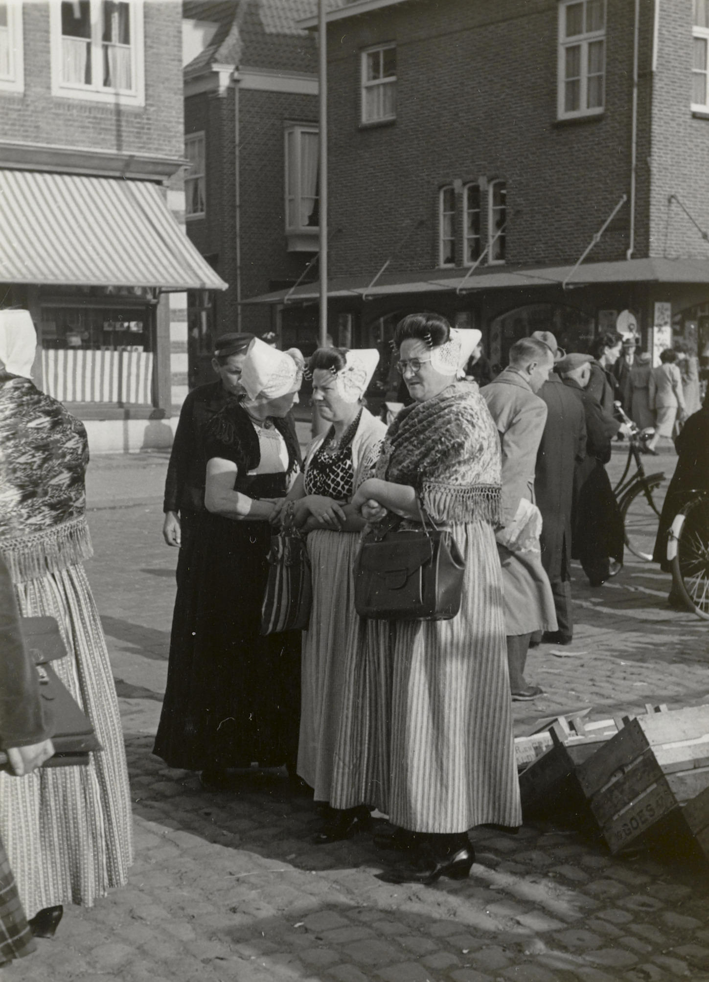 Vrouwen in Walcherse streekdracht op de markt in Middelburg. Ze zijn gekleed in opknapdracht.
