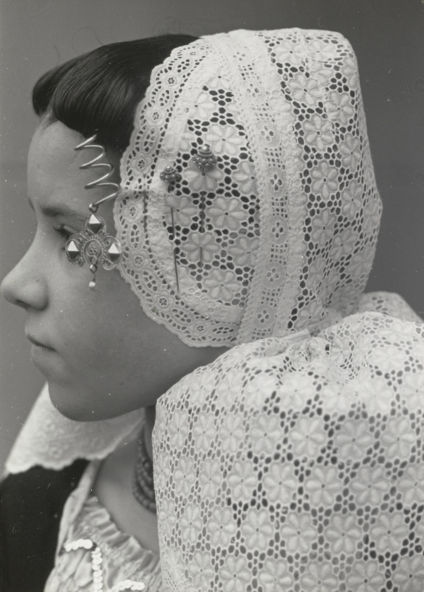 Kornelia Minderhoud uit Westkapelle in Walcherse dracht, 1950 (zwart-wit foto)