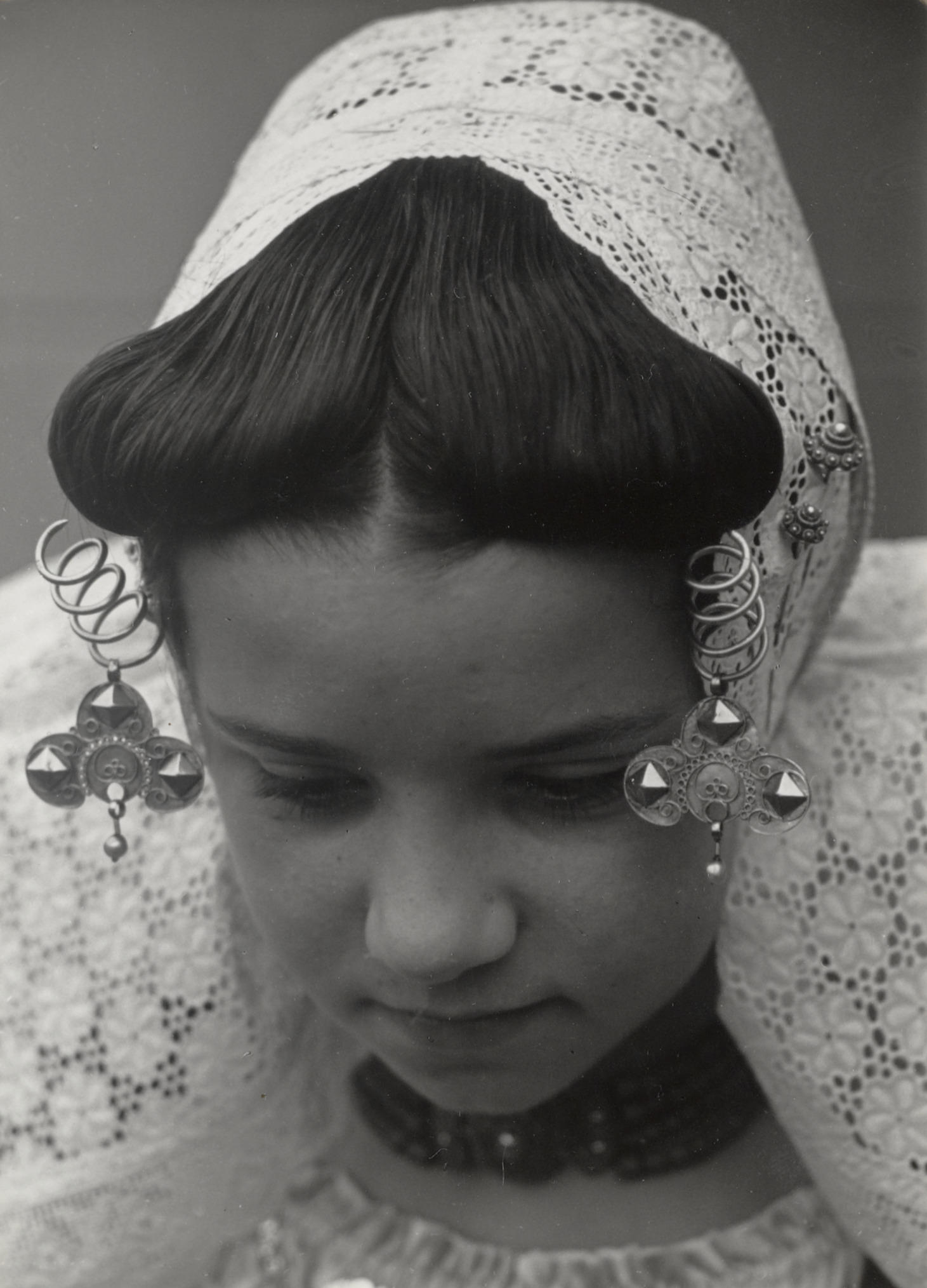 Kornelia Minderhoud uit Westkapelle in Walcherse dracht, 1950 (zwart-wit foto)