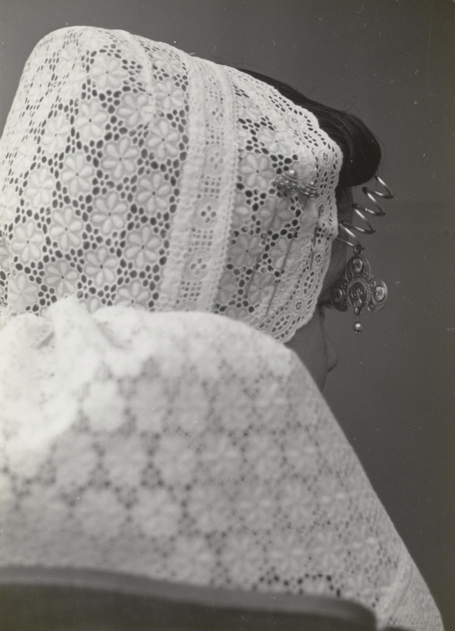 Kornelia Minderhoud uit Westkapelle in Walcherse dracht, 1950 (zwart-wit foto)