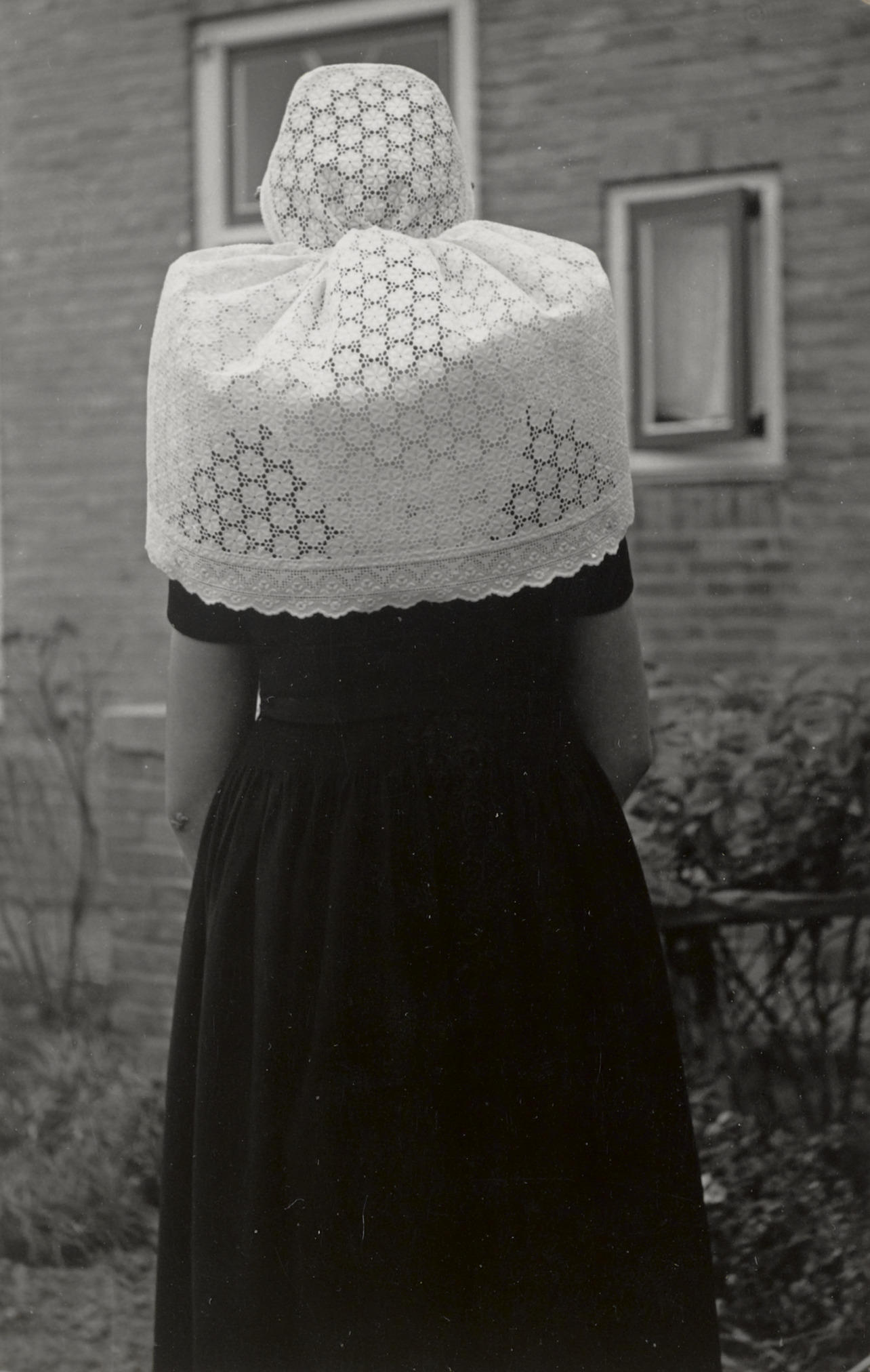 Kornelia Minderhoud uit Westkapelle in Walcherse dracht, 1950 (zwart-wit foto)