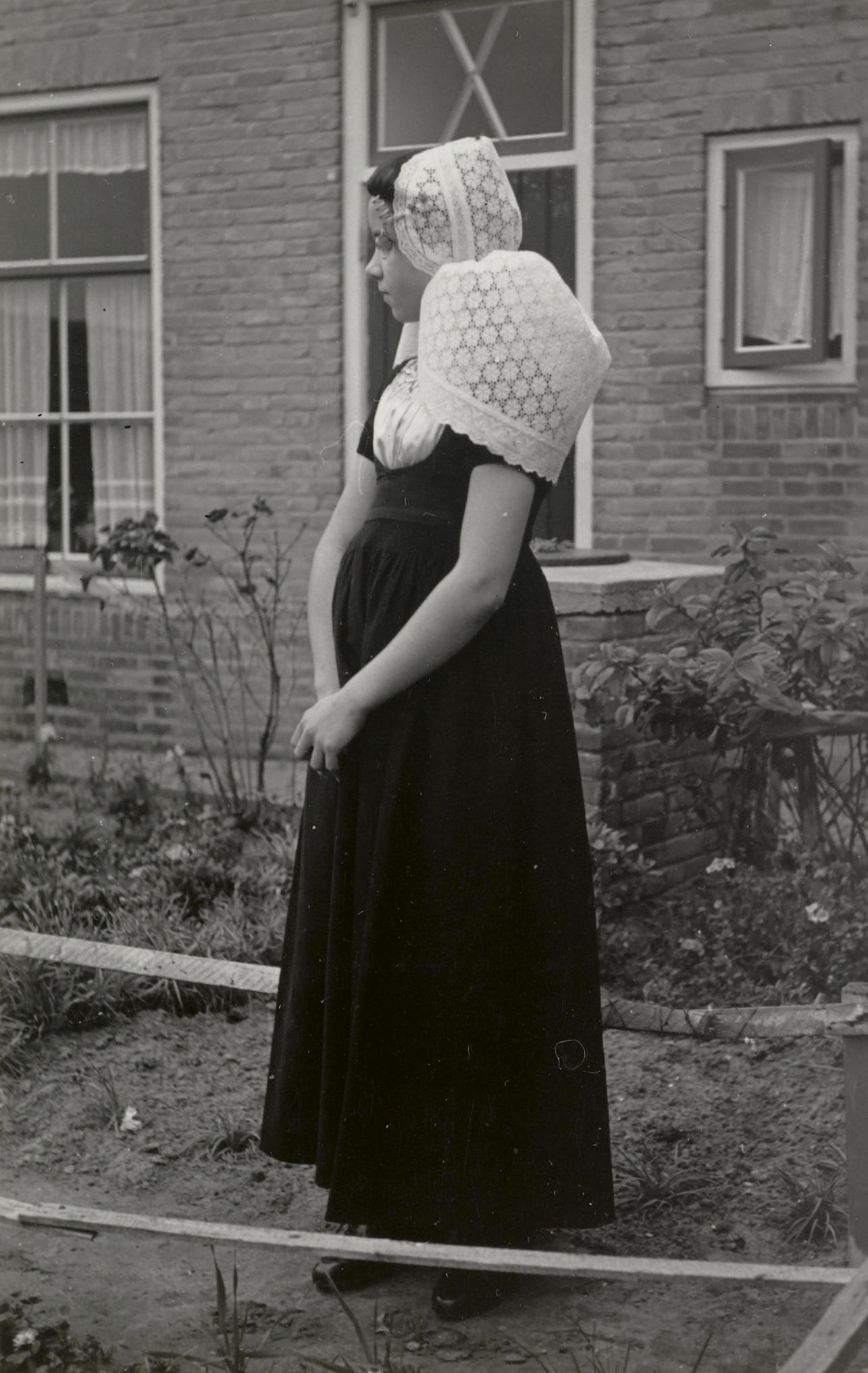 Kornelia Minderhoud uit Westkapelle in Walcherse dracht, 1950 (zwart-wit foto)