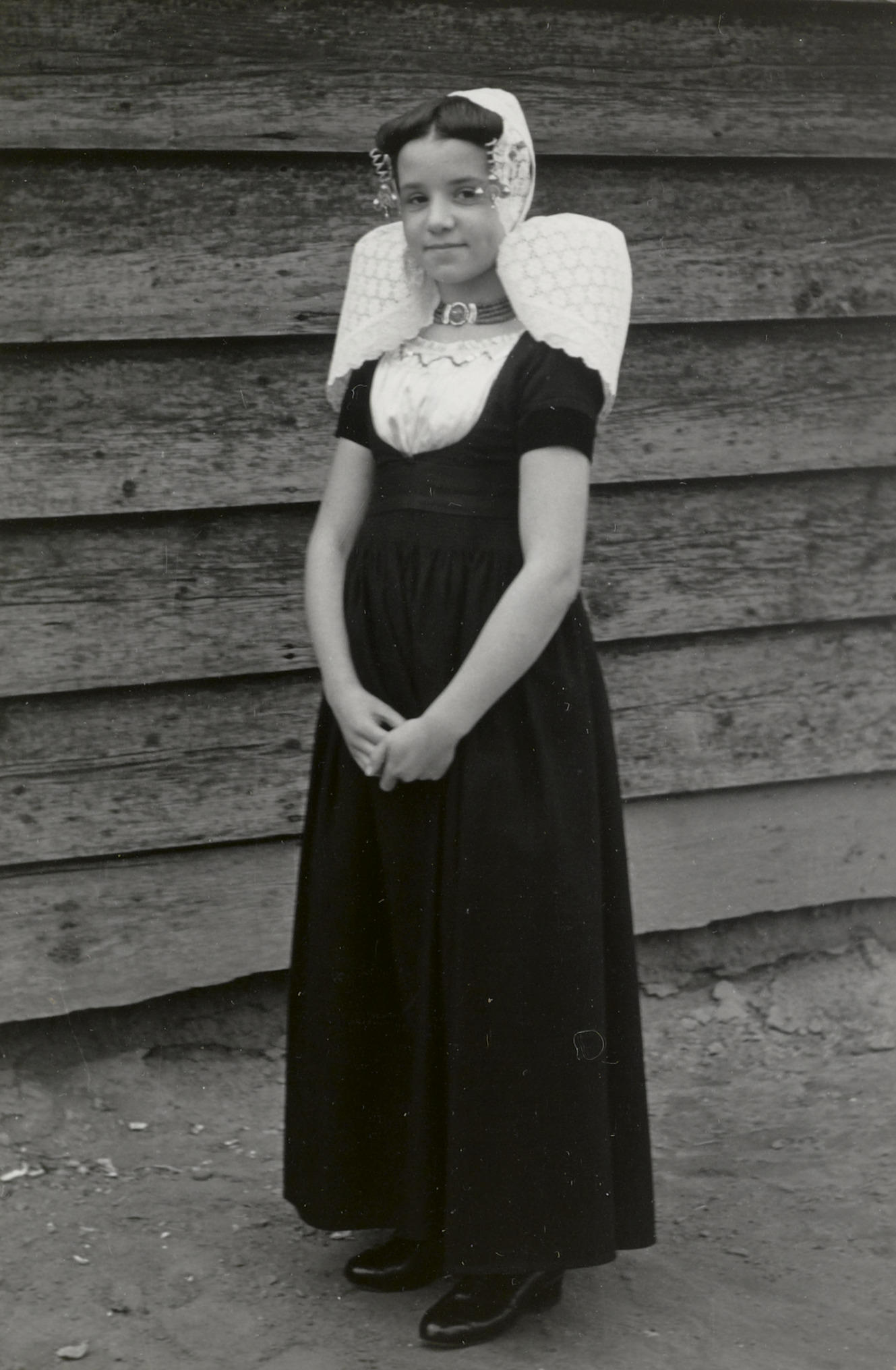 Kornelia Minderhoud uit Westkapelle in Walcherse dracht, 1950 (zwart-wit foto)