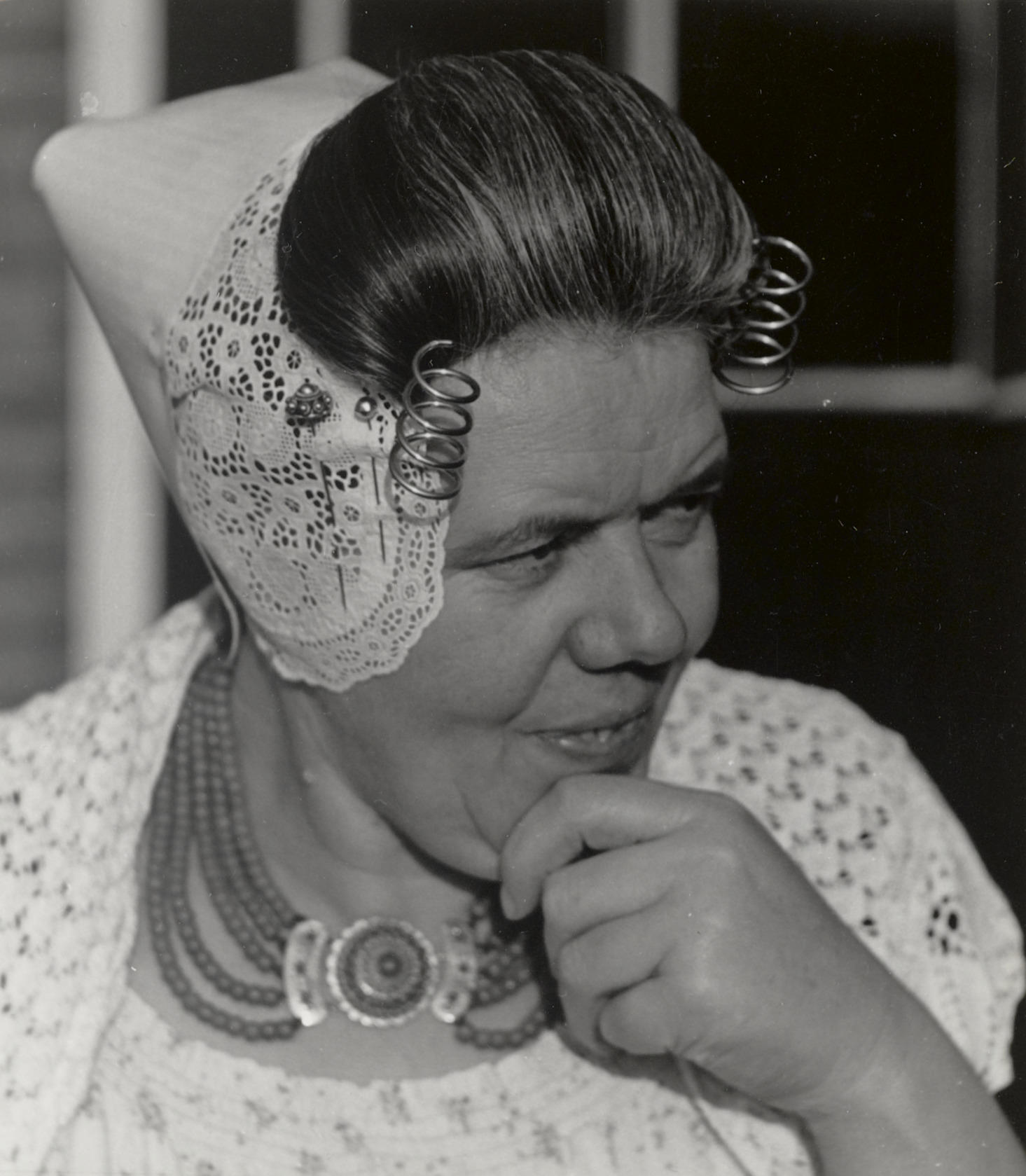 Martina de Vos uit Westkapelle in Walcherse dracht, 1950 (zwart-wit foto)