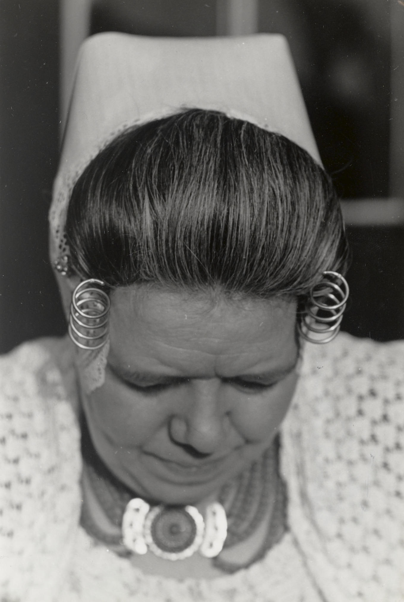 Martina de Vos uit Westkapelle in Walcherse dracht, 1950 (zwart-wit foto)