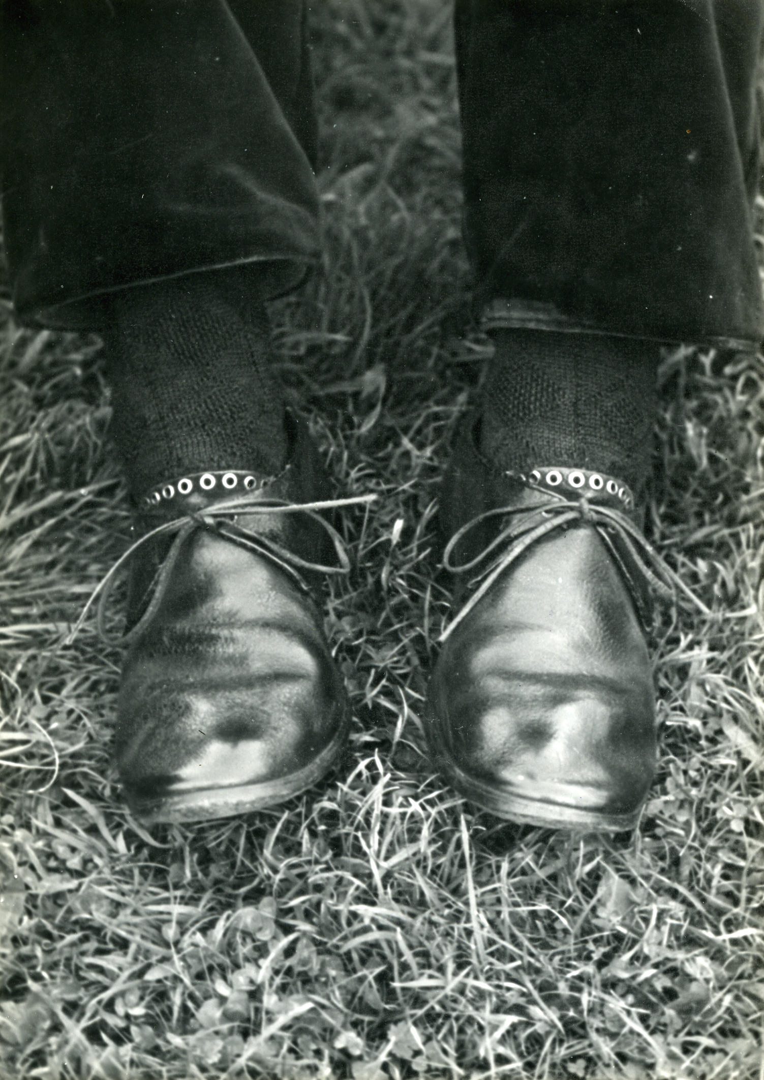 Schoenen van Klaas Remijn uit 's-Heerenhoek. Klaas is gekleed in katholieke Zuid-Bevelandse streekdracht. Hij draagt de zondagse dracht.