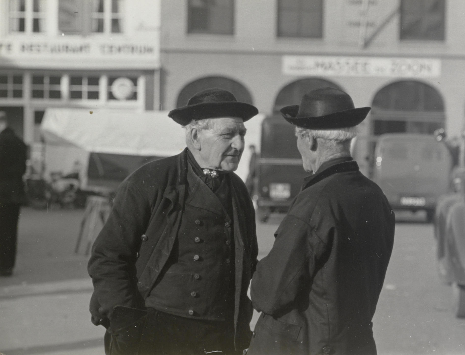 Twee mannen in protestantse Zuid-Bevelandse streekdracht op de markt in Goes. Ter gelegenheid van het marktbezoek dragen de mannen hun zondagse pak.