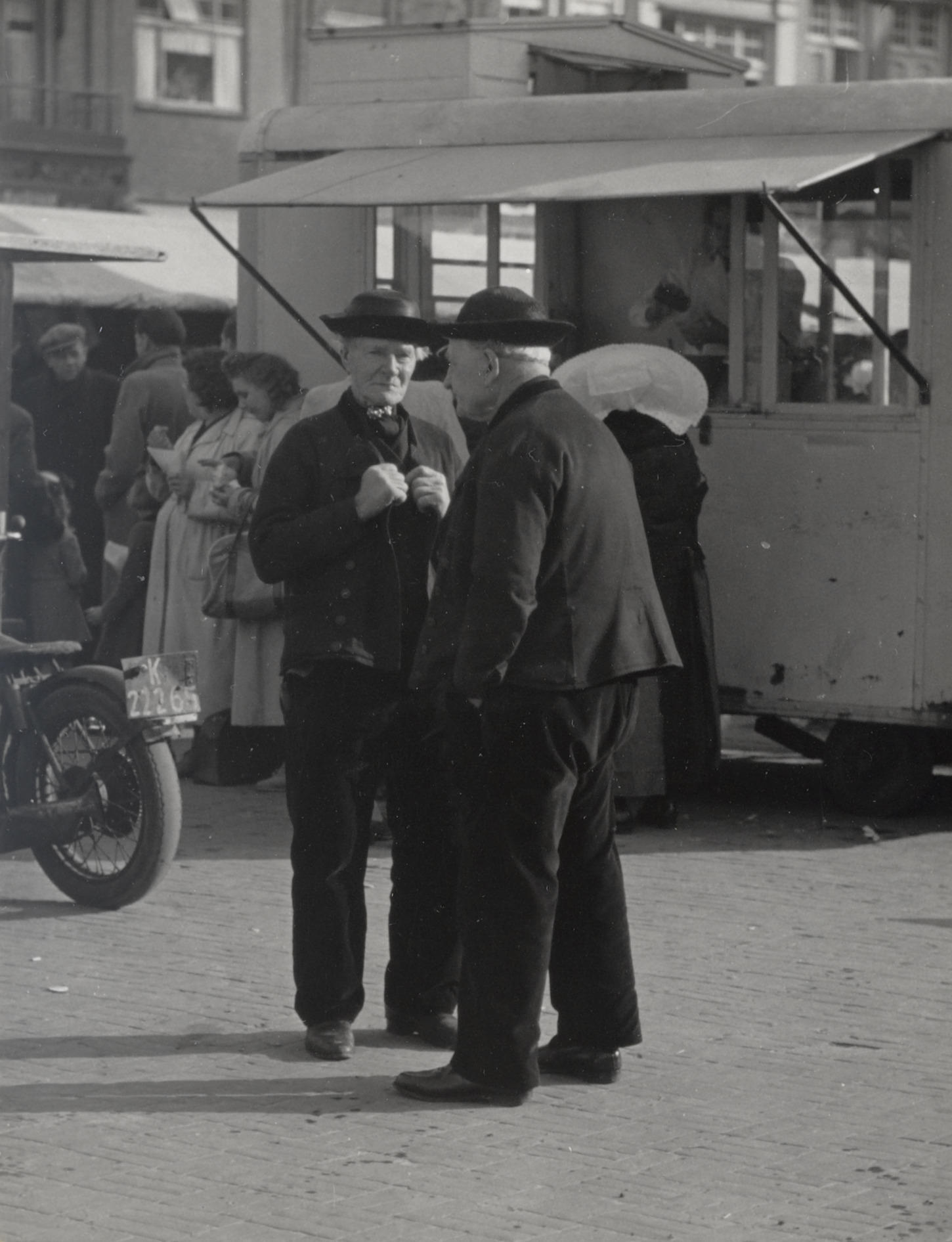 Twee mannen in protestantse Zuid-Bevelandse streekdracht op de markt in Goes. Ter gelegenheid van het marktbezoek dragen de mannen hun zondagse pak.