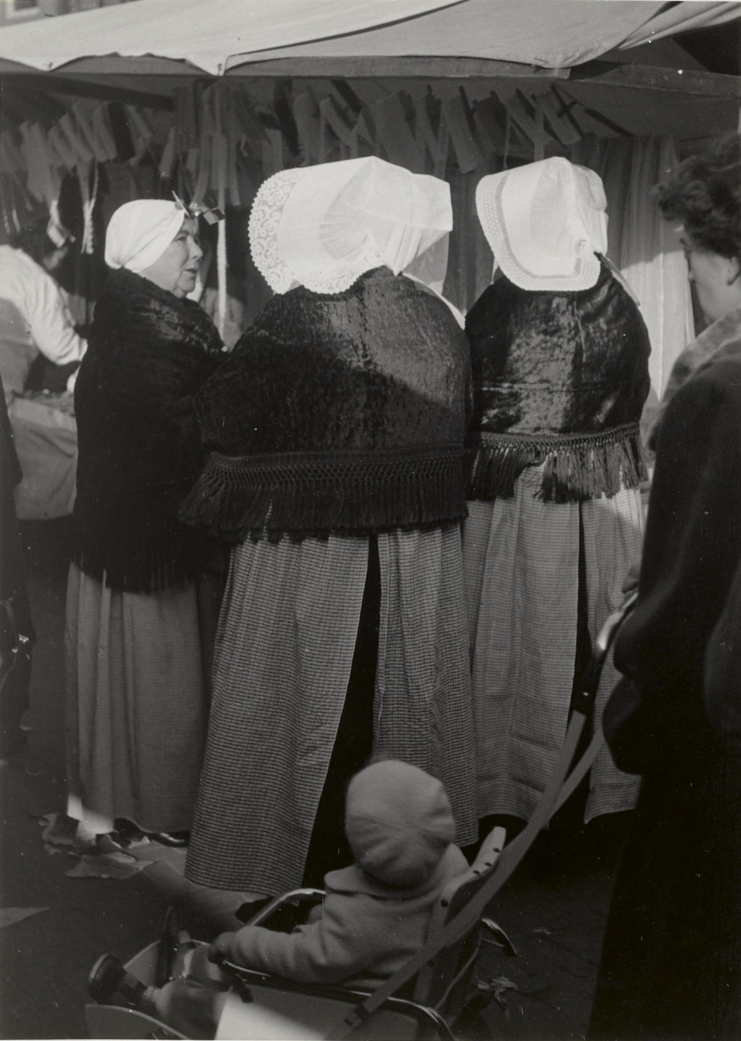 Vrouwen in Zuid-Bevelandse streekdracht op de markt in Goes. Ze zijn gekleed in opknapdracht. De linker vrouw draagt de katholieke dracht; de twee rechter vrouwen dragen de protestantse dracht.
