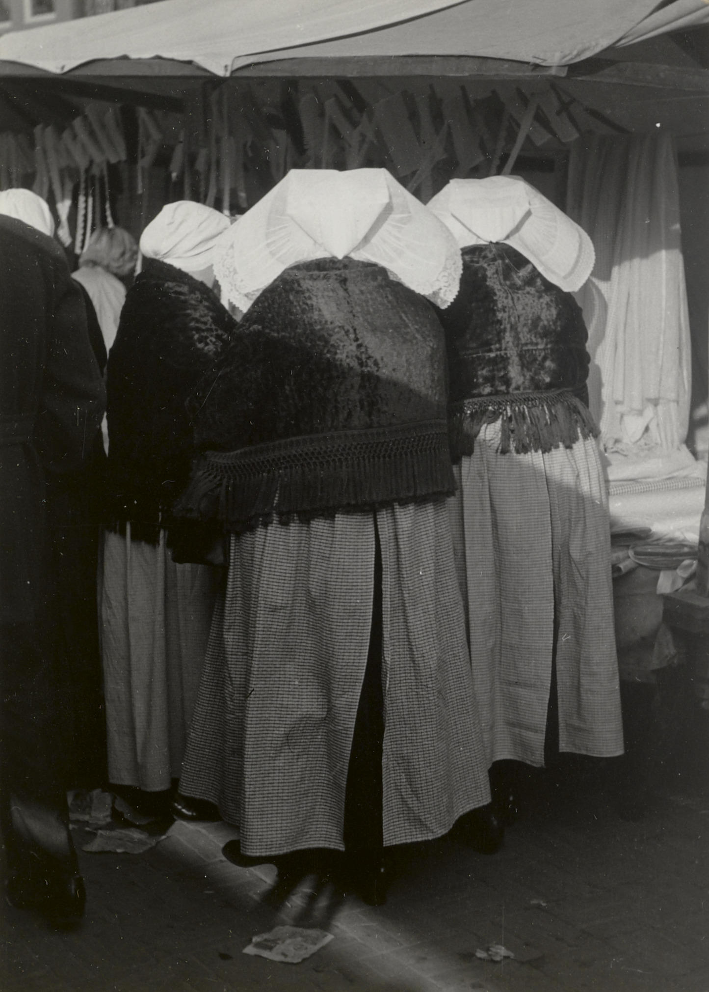 Vrouwen in Zuid-Bevelandse streekdracht op de markt in Goes. Ze zijn gekleed in opknapdracht. De linker vrouw draagt de katholieke dracht; de twee rechter vrouwen dragen de protestantse dracht.