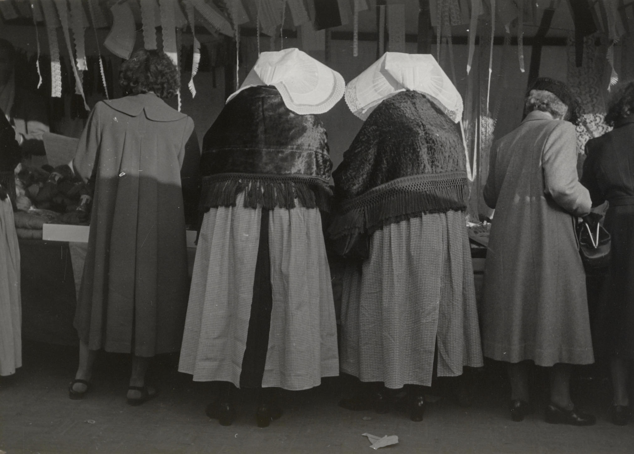 Vrouwen in protestantse Zuid-Bevelandse dracht, Goes, 1950 (zwart-wit foto)