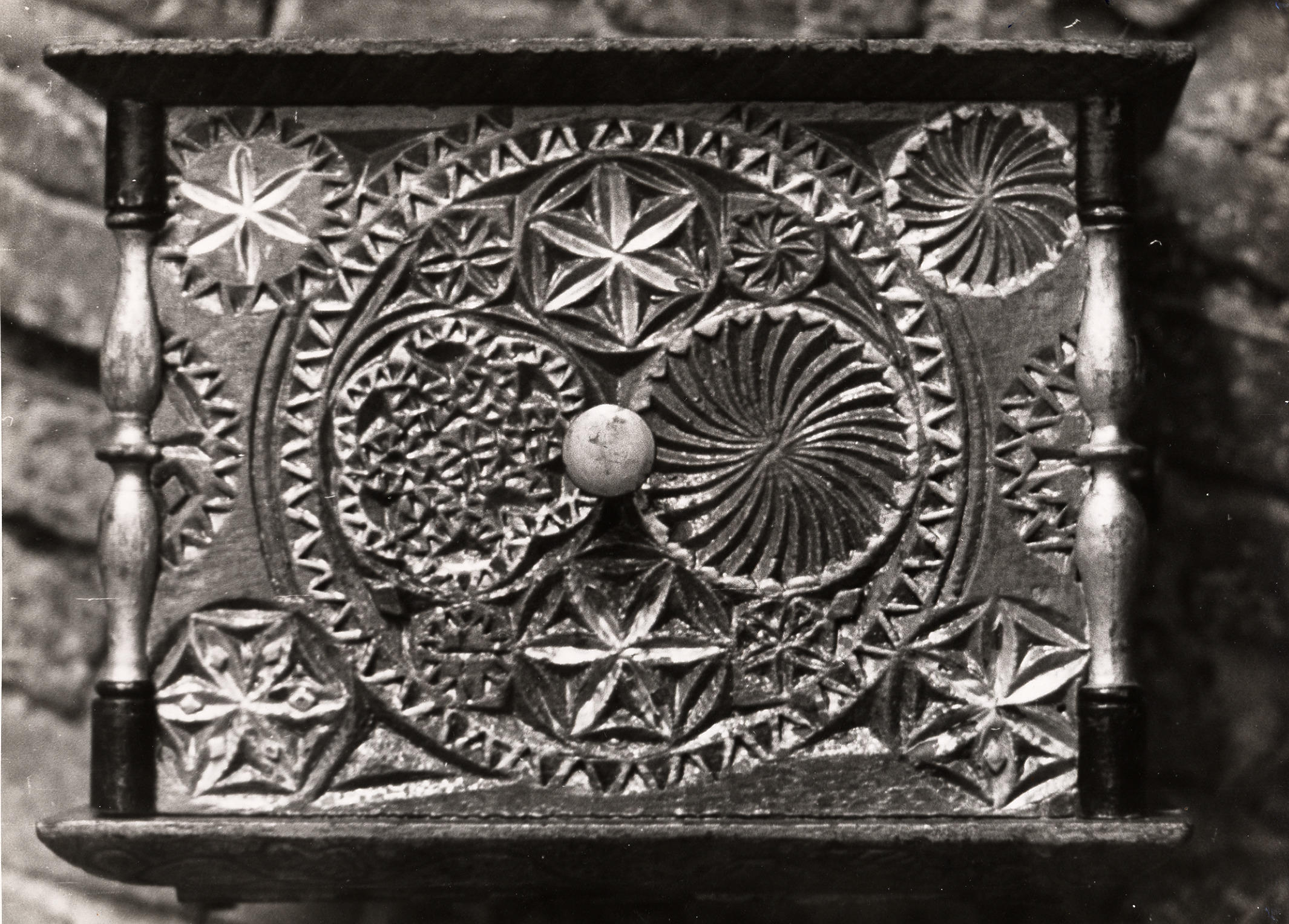 Kerkstoof met snijwerk, Staphorst, 1944 (zwart-wit foto)