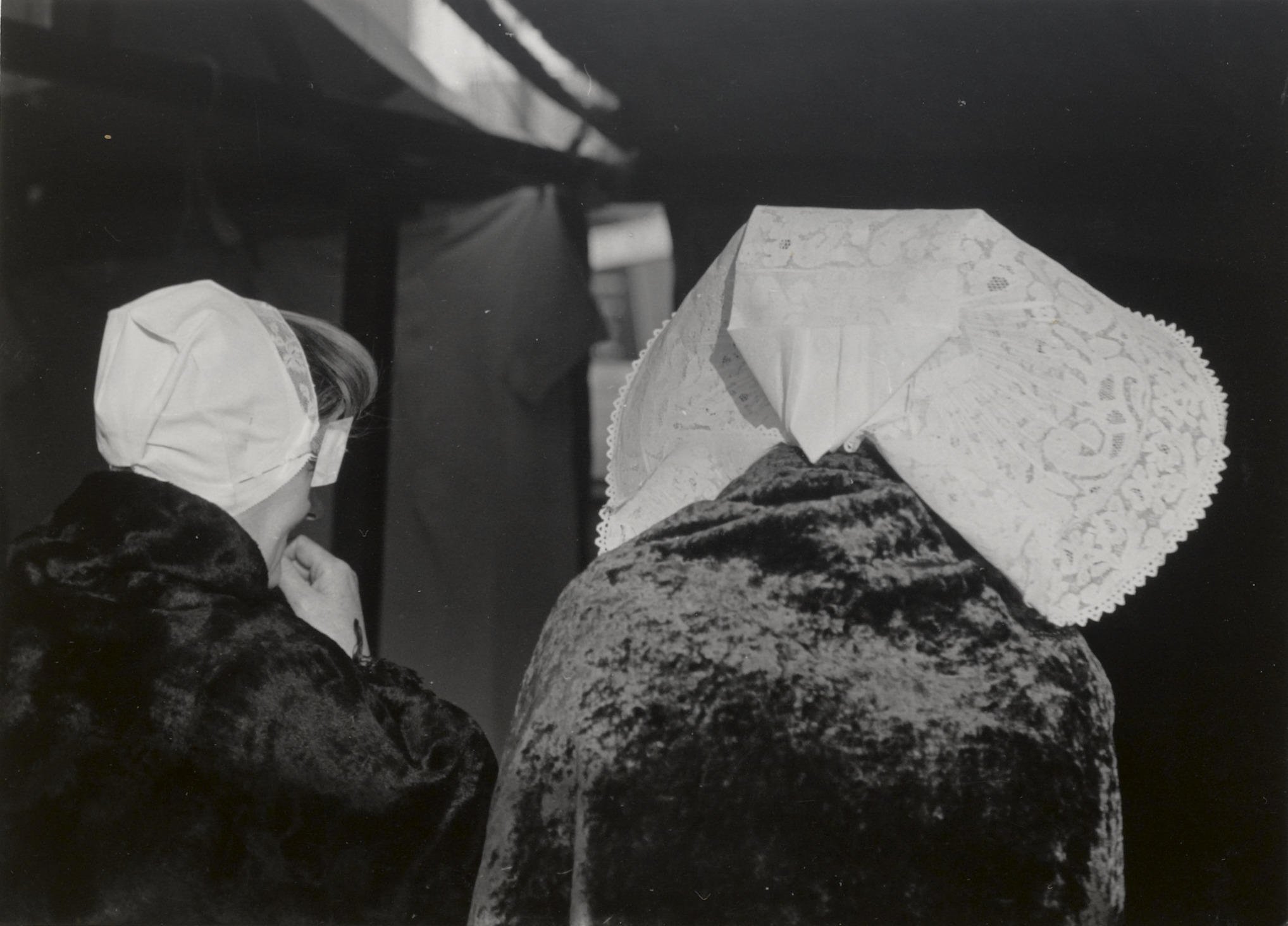 Twee vrouwen in protestantse Zuid-Bevelandse streekdracht op de markt in Goes. Ze zijn gekleed in opknapdracht.