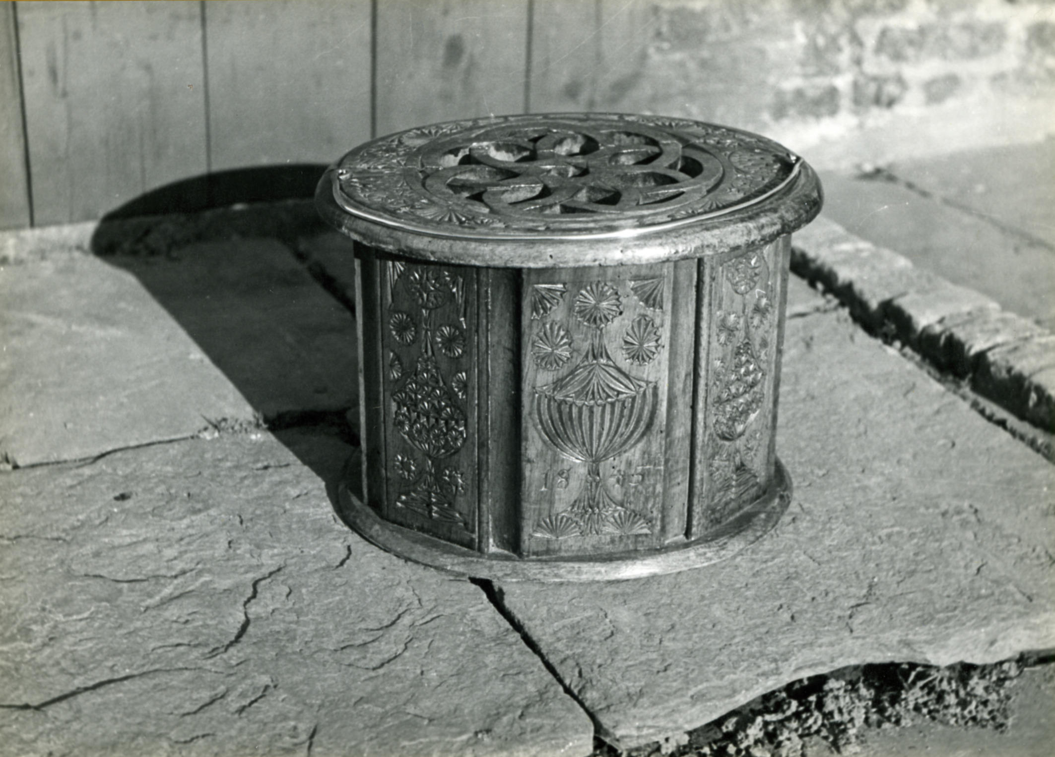 Eikenhouten kerkstoof, versierd met houtsnijwerk. De stoof is eigendom van een persoon uit Cadzand.