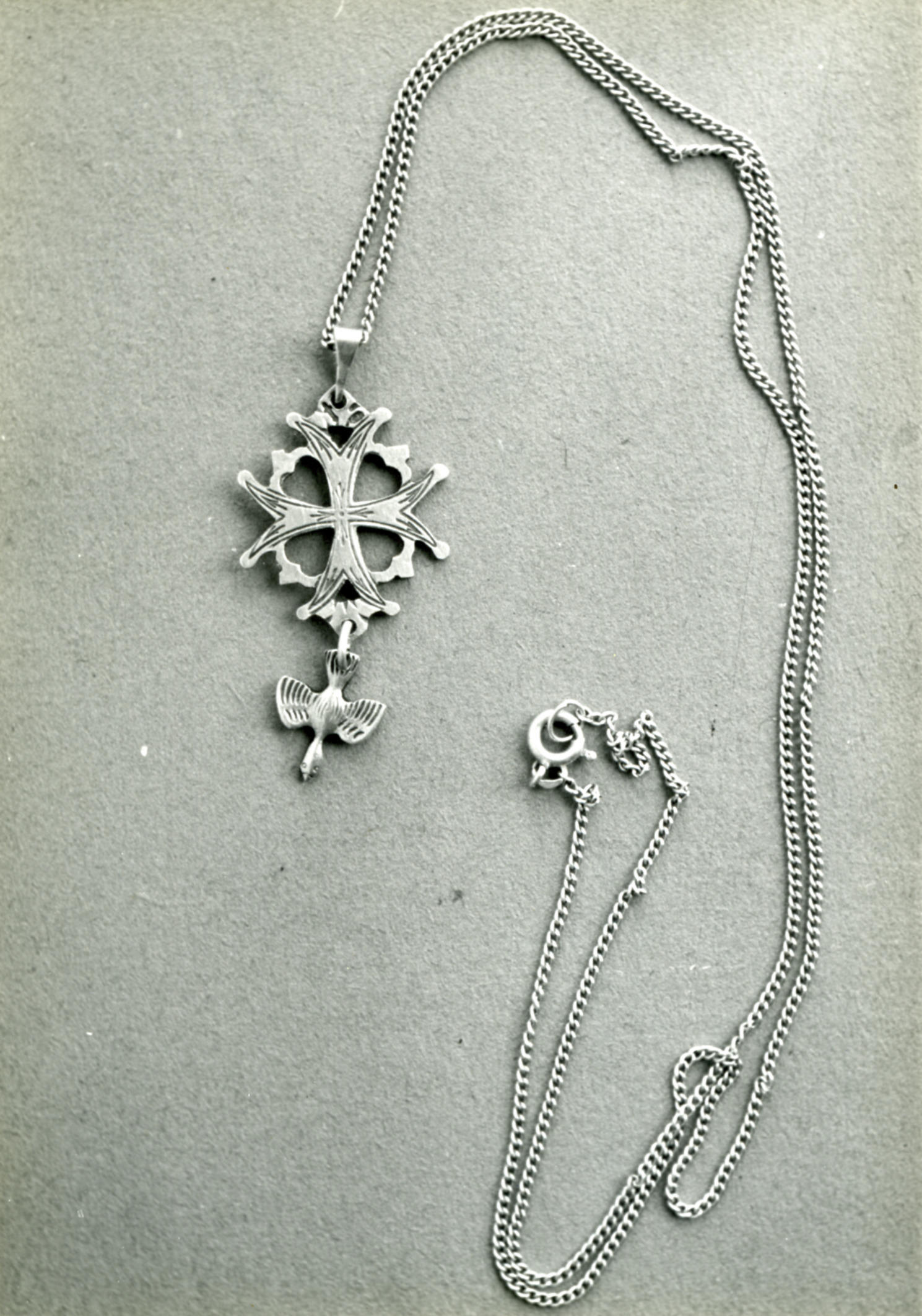 Ketting met Hugenotenkruis uit Cadzand, 1950 (zwart-wit foto)