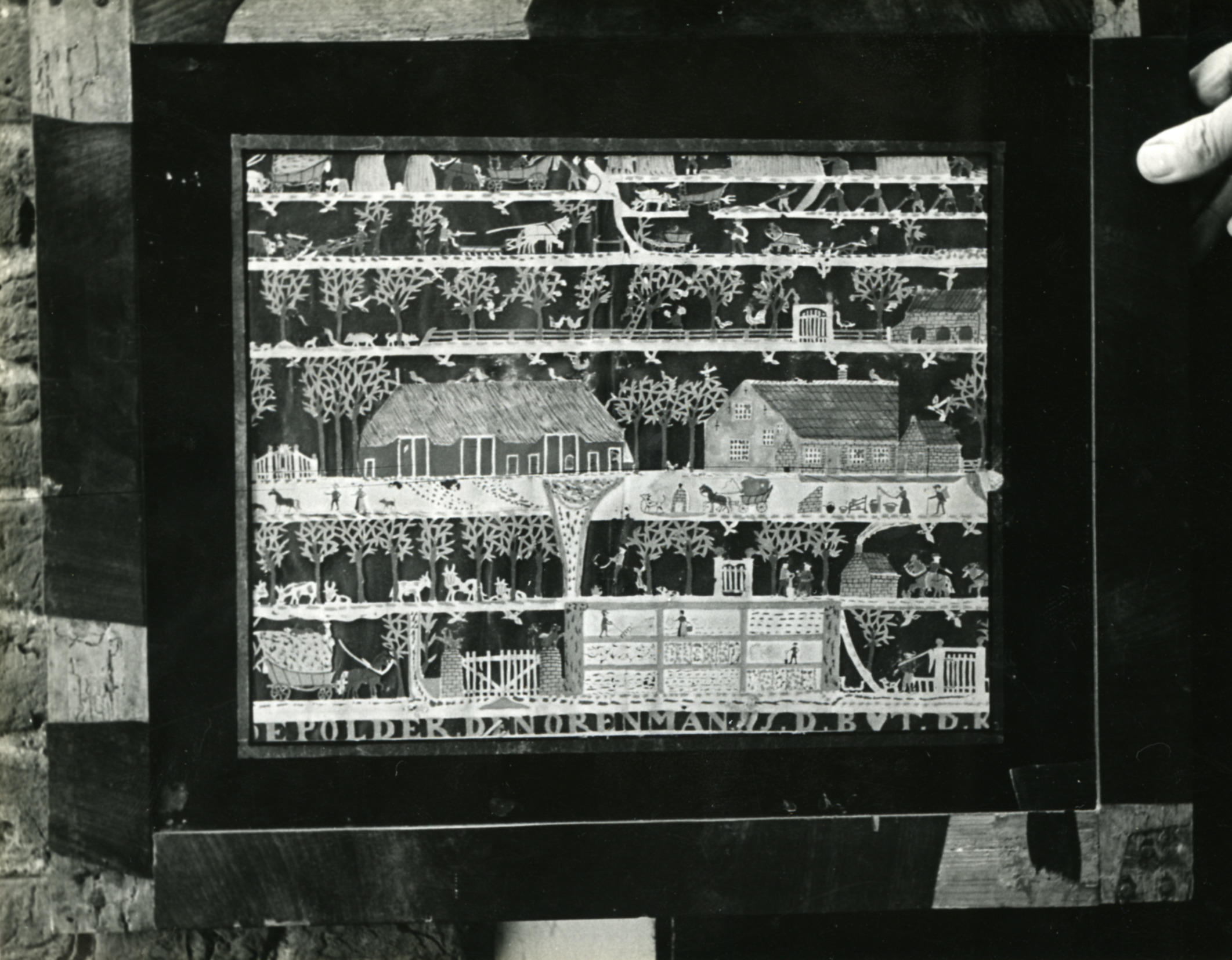 Ingelijst knipwerk, gemaakt in 1842 in Cadzand door 'Jan de prentenknipper' (Jan Huyssoon). Het knipwerk stelt een Zeeuwse boerderij met een erf, werkzaamheden, gereedschappen en vee voor. Het onderschrift luidt: 'De polder Den Norenman. J.D.B. T.D.K.'