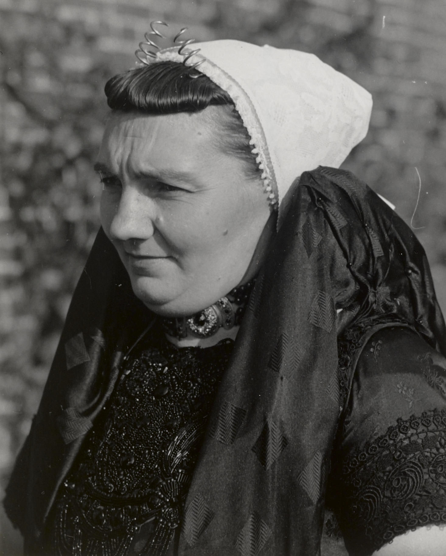 Pieternella Steendijk-Dekker uit Magrette in Axelse streekdracht. Ze is gekleed in zondagse dracht en is in de rouw.
