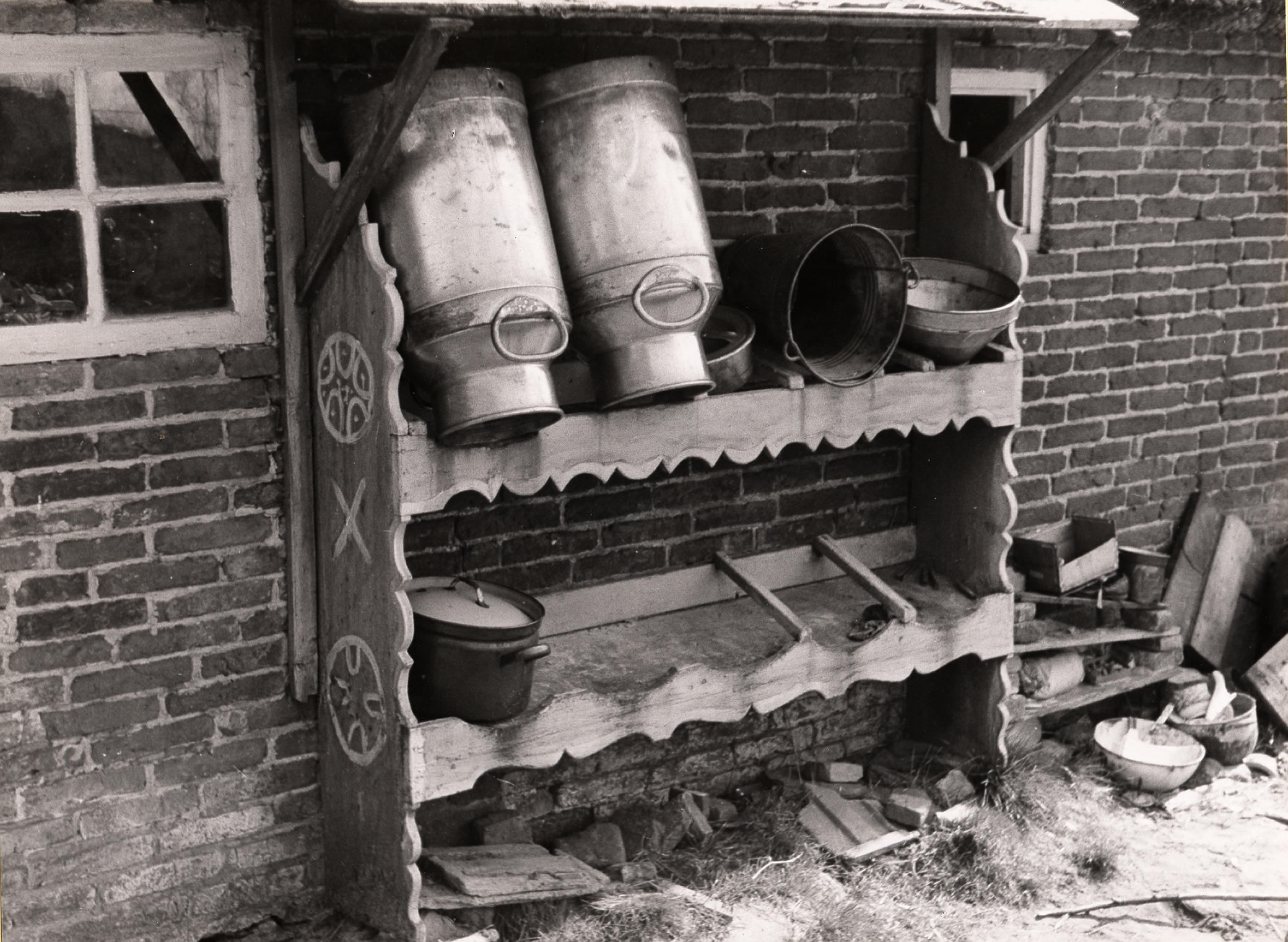 Melkbussenrek in Staphorst, met rechts daarvan een 'speulhuus' (speelhuisje). Een speelhuisje bestond doorgaans uit opgestapelde stenen en planken waarop afgedankte potten, pannen en gebroken serviesgoed werden uitgestald. Hier werd door kinderen mee gespeeld.