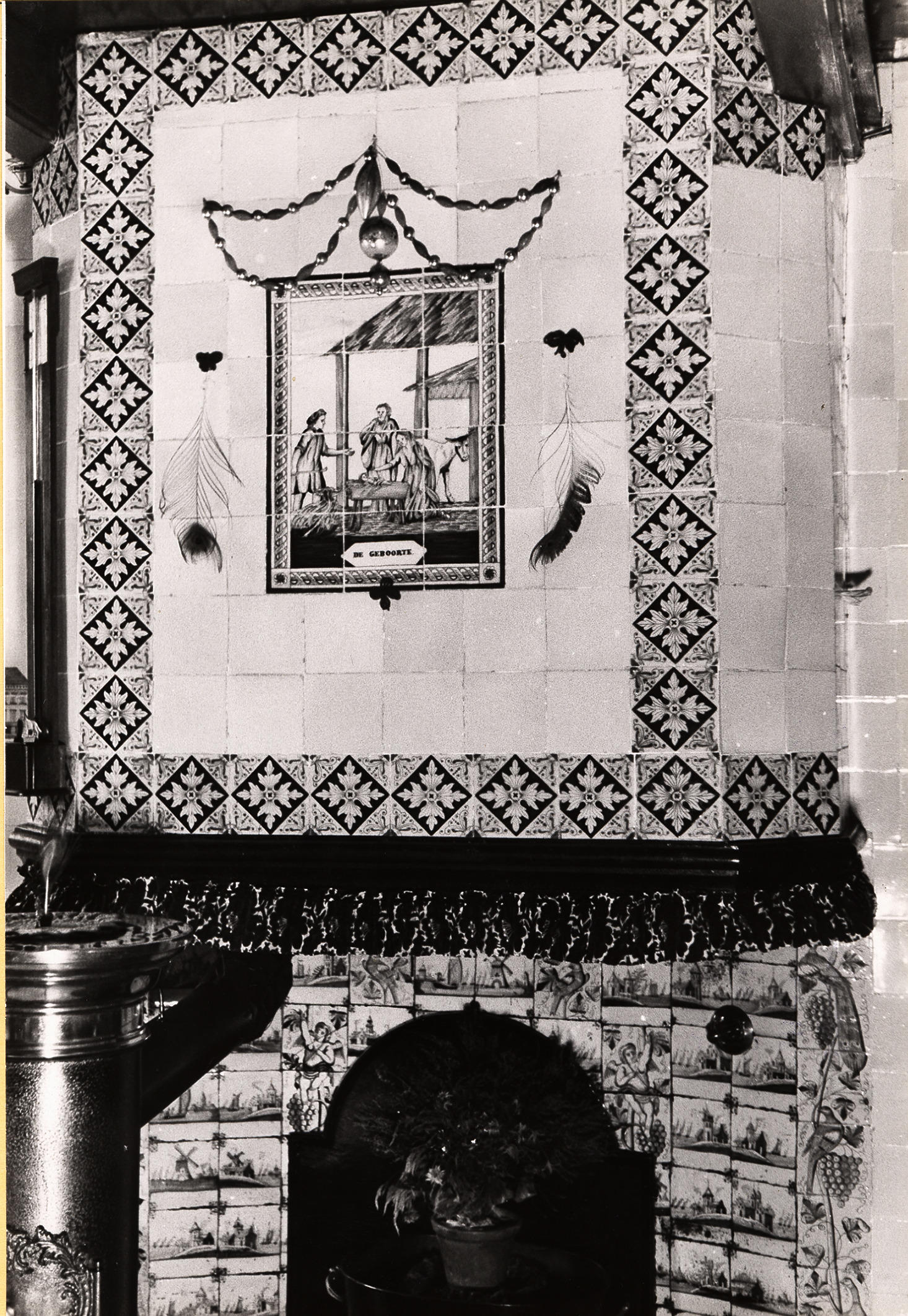 Betegelde schouw met een tegeltableau van 'Christus' geboorte' in Staphorst. Langs de randen van de schouw geornamenteerde tegels met bloemmotief. Boven het tegeltableau is kerstversiering opgehangen en aan weerszijden van het tableau hangt een pauwenveer. Rondom de rand van de schouw hangt een geplooide, gedessineerde schoorsteenval. Onder de schouw diverse tegels met landschappen, vogels, druivenranken ...