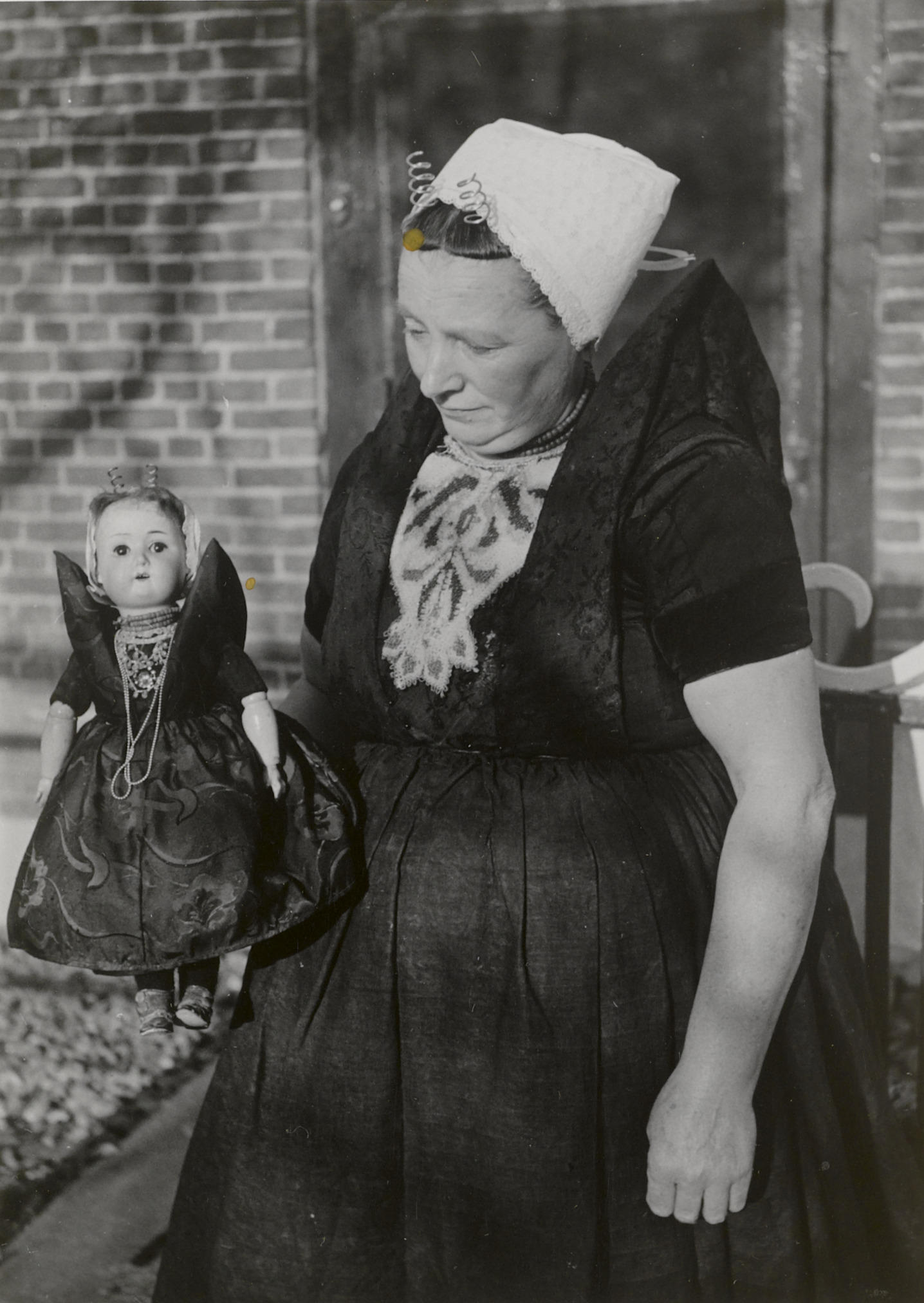 Suzanna van de Wege in Axelse dracht met pop, 1950 (zwart-wit foto)