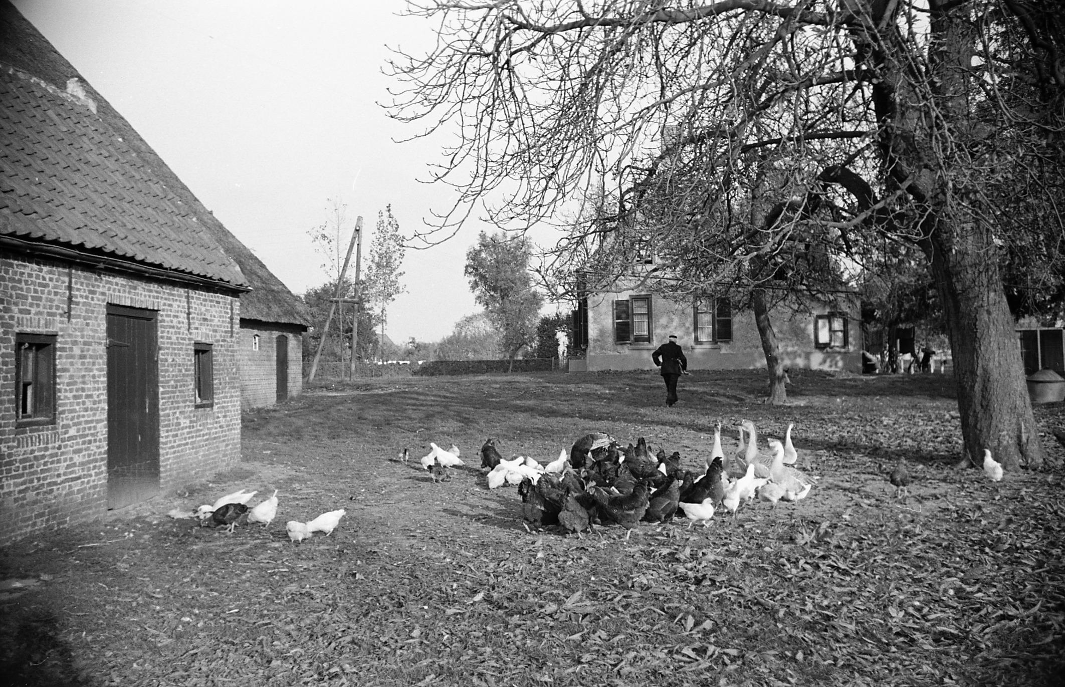 Erf van hoeve Doornhof in de Buthpolder bij Axel. Het woonhuis staat los van de schuren. Op het erf scharrelen kippen.