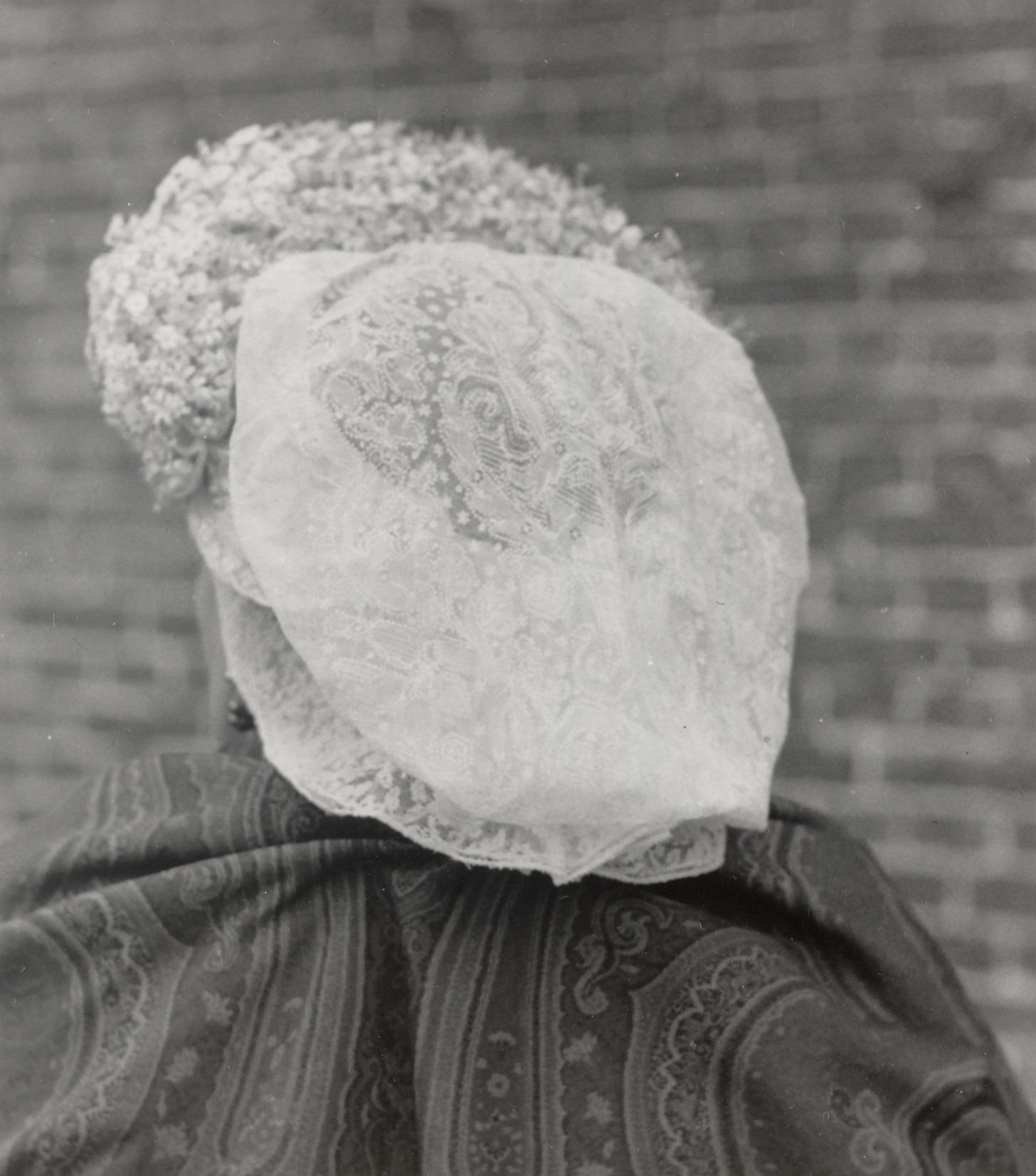Vrouw uit Princenhage in streekdracht. Ze is gekleed in zondagse dracht, met 'volgewerkte doek' (omslagdoek). Over de 'dubbele muts' draagt ze een 'kroon' met kunstbloemetjes.
