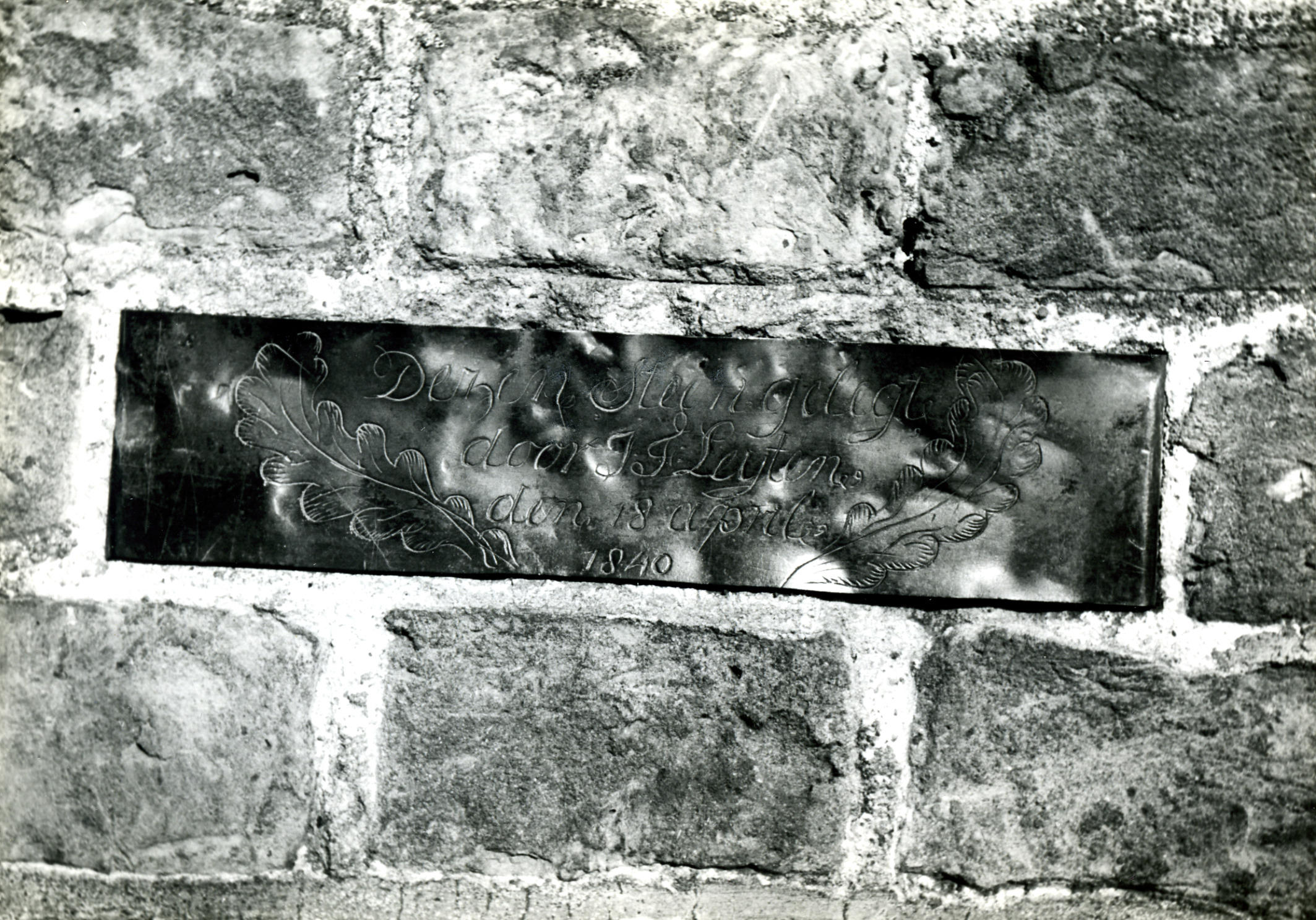 Koperen plaatje met daarop de tekst: 'Dezen steen gelegt door J.F. Leyten den 18 april 1840', in een gevel van een woning in Breda.