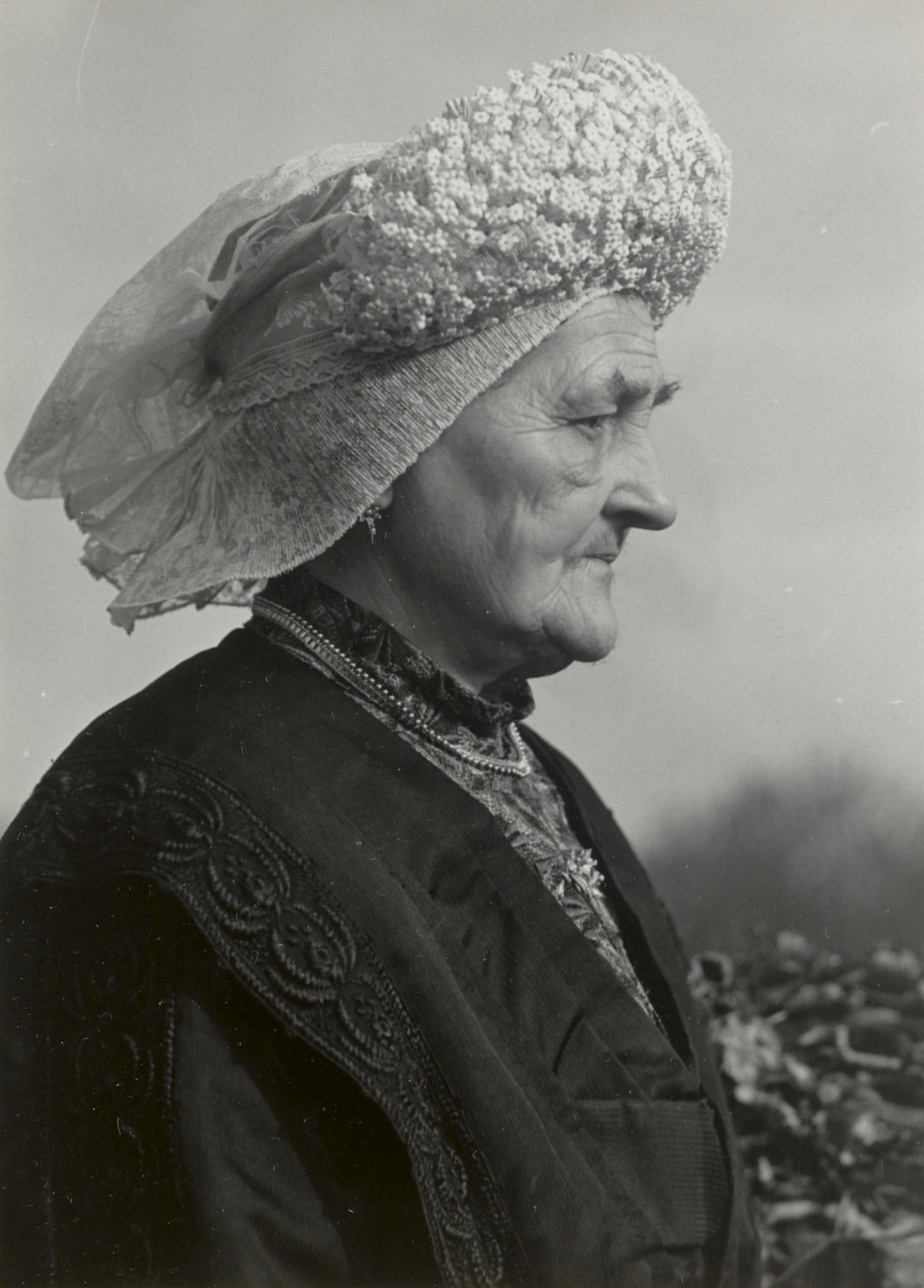 Vrouw uit Princenhage in streekdracht, 1950 (zwart-wit foto)
