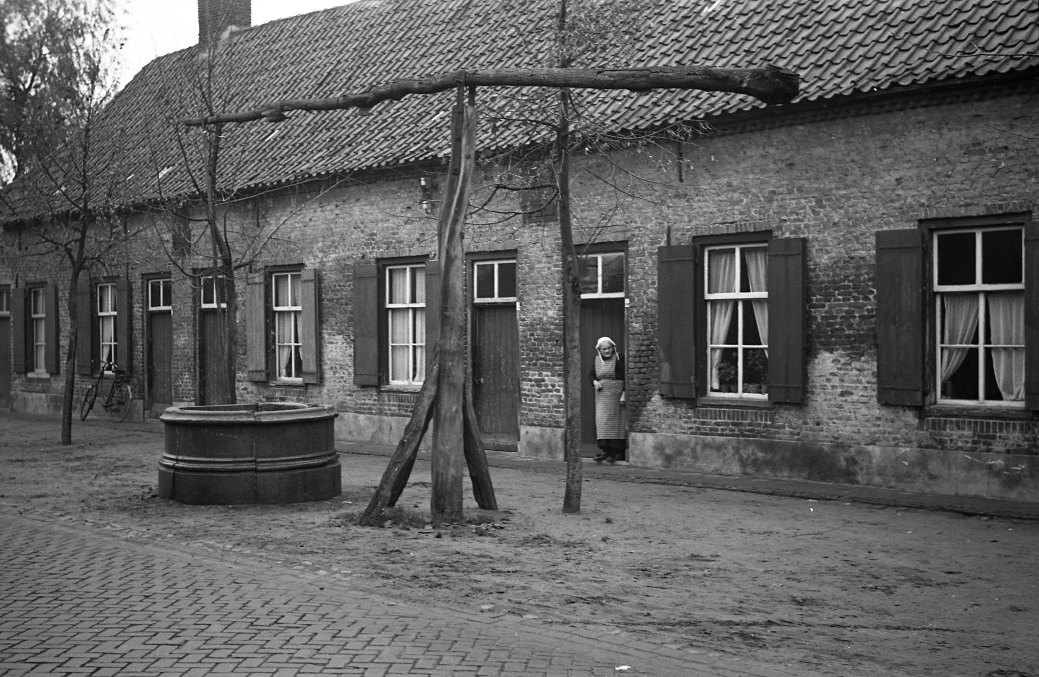 Woningen naast put, Oirschot, 1950 (zwart-wit negatief)