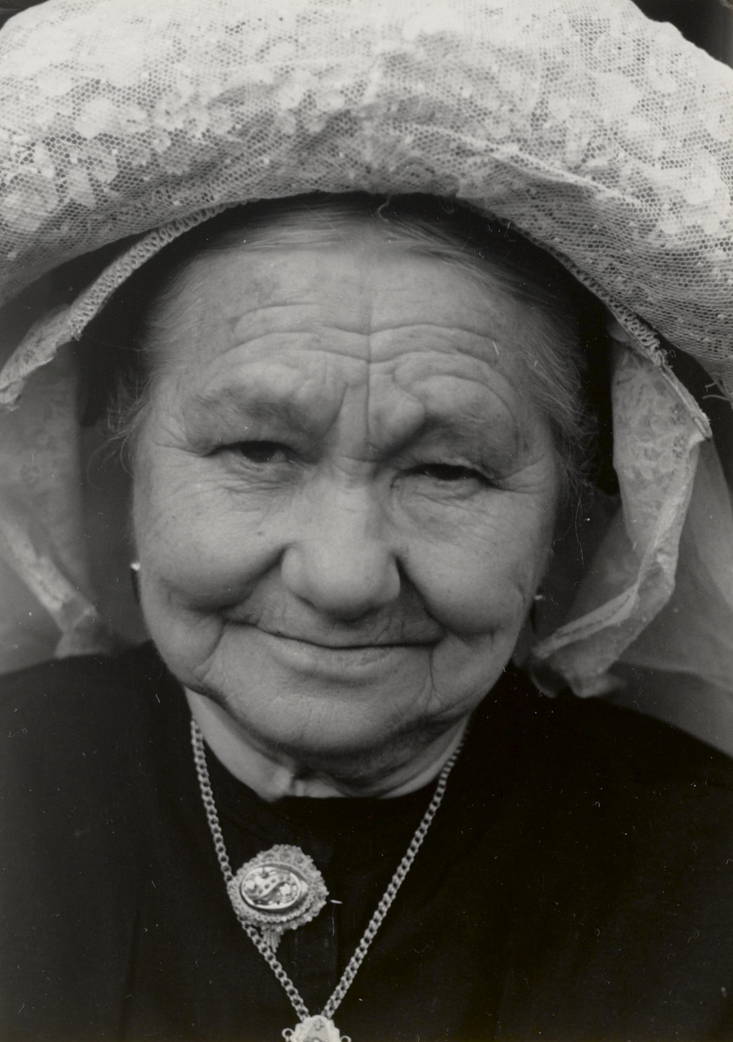 Vrouw uit Oirschot in zondagse dracht, 1950 (zwart-wit foto)