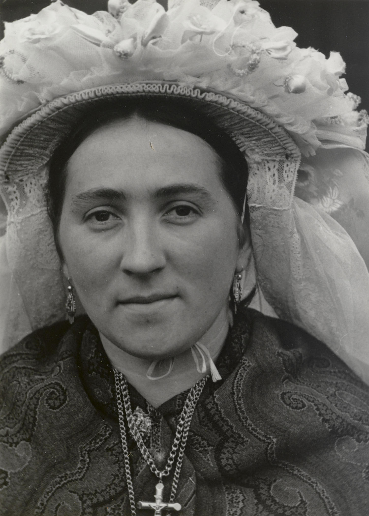 Vrouw in dracht uit Sevenum, 1950 (zwart-wit foto)