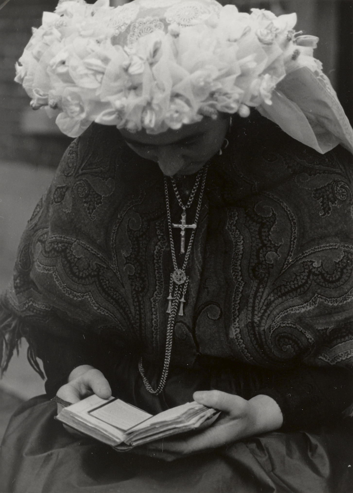 Nel van den Goor-van Enckevort uit De Hees, een buurtschap bij Sevenum. Nel is speciaal voor de foto verkleed in de Noord-Limburgse streekdracht van haar moeder. Ze is gekleed in zondagse dracht. Over de muts draagt ze een zogenoemde toer, een losse versiering met kunstbloemen en linten, die op hoogtijdagen op de muts wordt geplaatst. ...