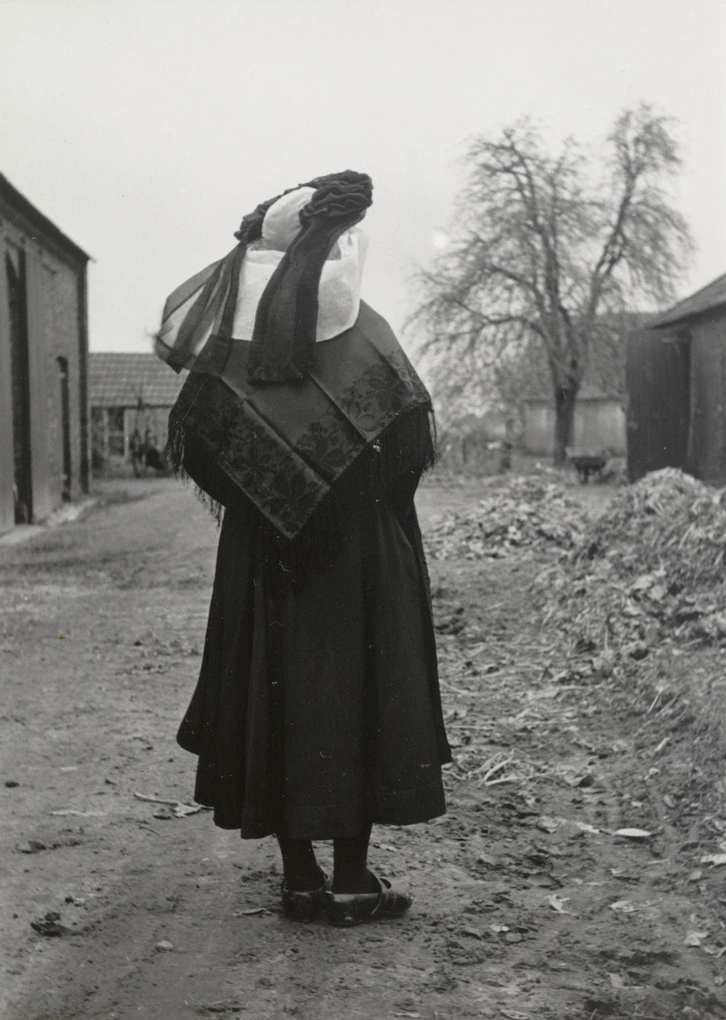 Nel van den Goor-van Enckevort uit De Hees, een buurtschap bij Sevenum. Nel is speciaal voor de foto verkleed in de Noord-Limburgse streekdracht van haar moeder. Ze is gekleed in zondagse rouwdracht. Over de batisten muts draagt ze een zogenoemde toer, een losse versiering die op hoogtijdagen op de muts wordt geplaatst. De rouwtoer is ...