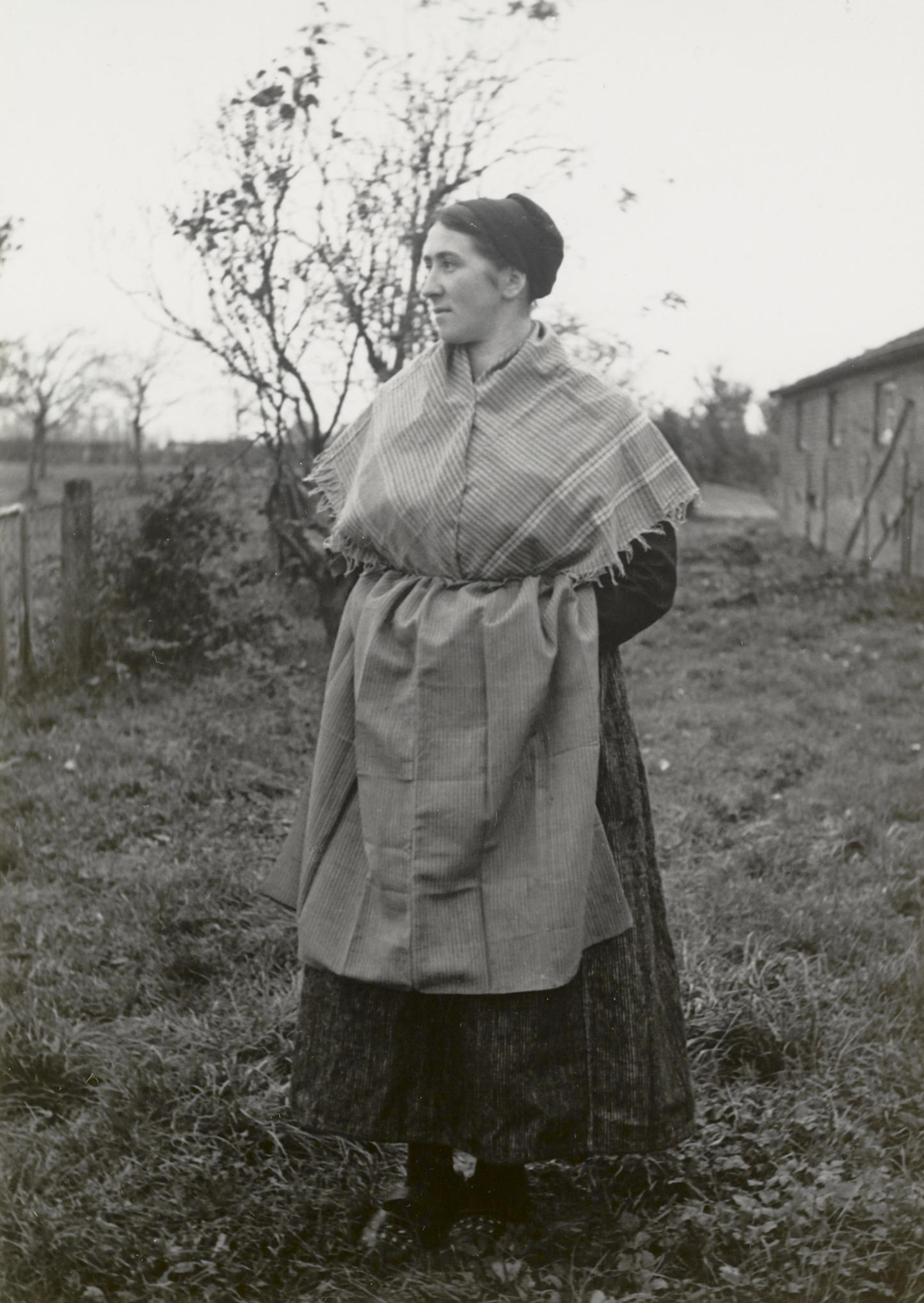 Vrouw in daagse dracht uit Sevenum, 1950 (zwart-wit foto)