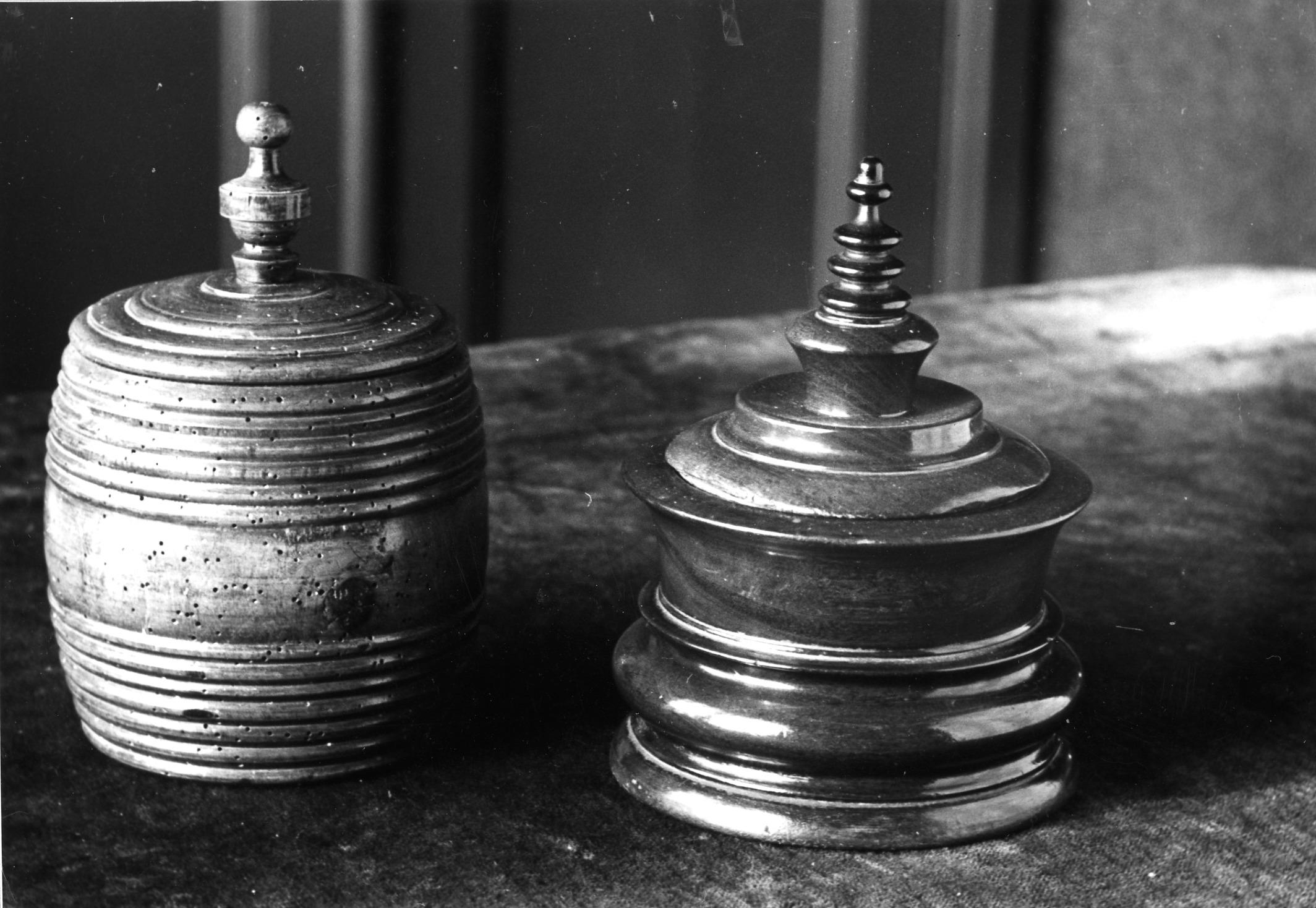 Twee tabakspotten van gedraaid hout, eigendom van een familie in Striep.