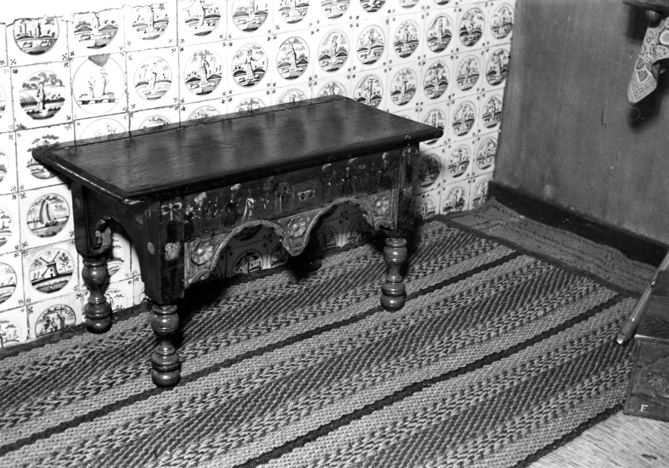 Zogenoemd Amelander beddenbankje, gebruikt op Terschelling. Het houten bankje is beschilderd met de voorstelling van de vijf wijze en de vijf dwaze maagden. Hij is eigendom van een vrouw in Hoorn.