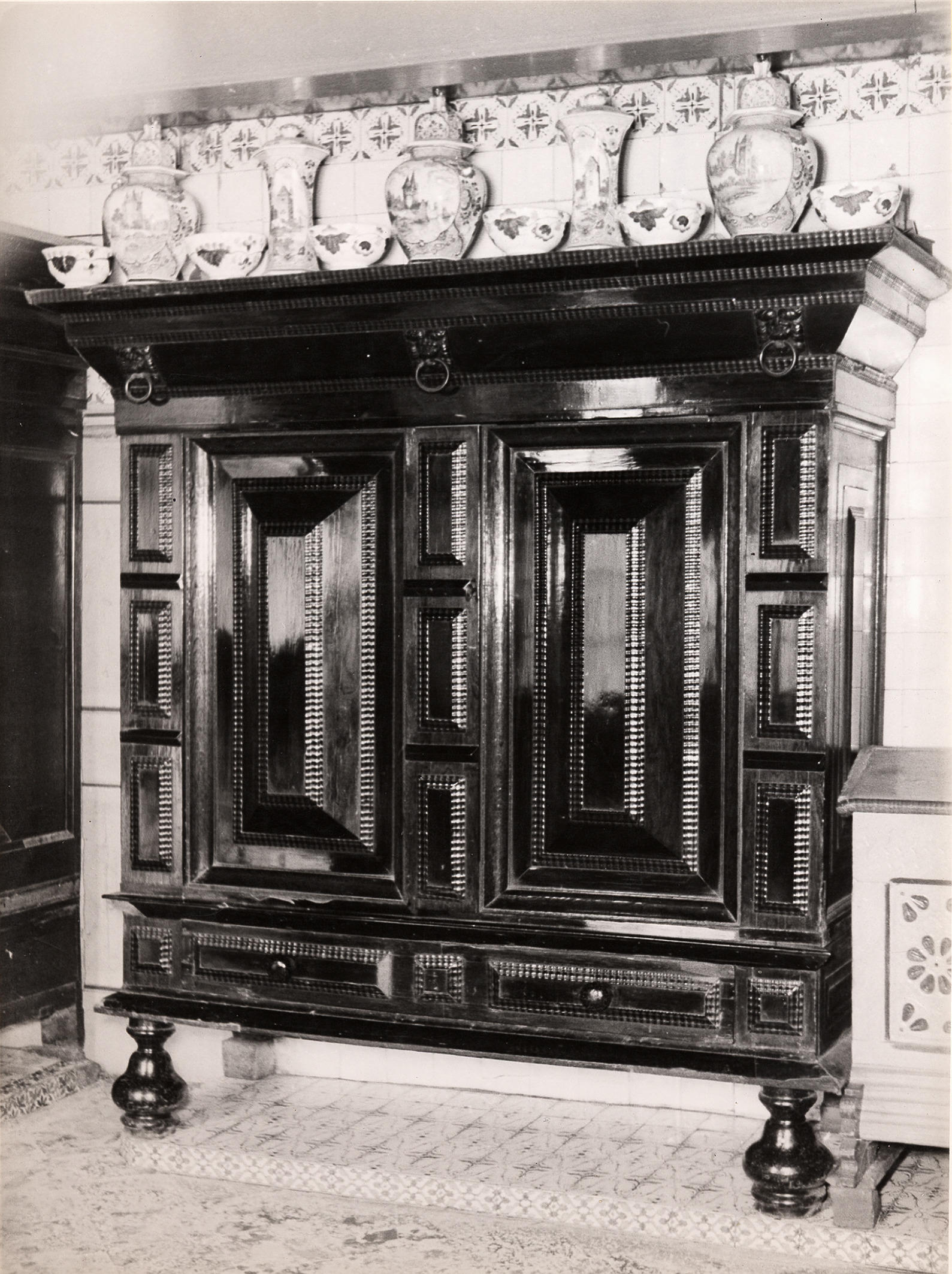 Kussenkast met kaststel en kastkommen, Staphorst, 1944 (zwart-wit foto)