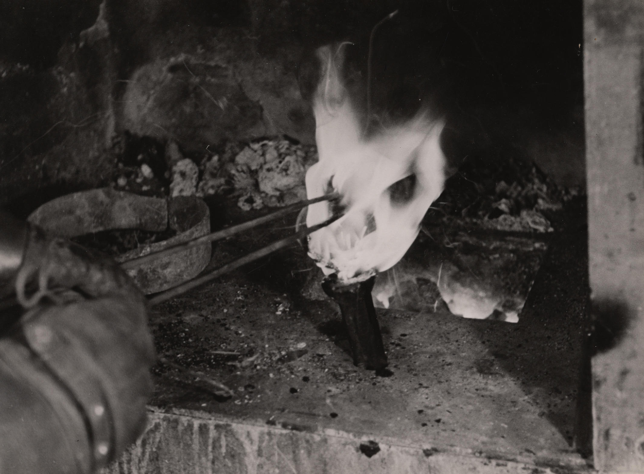 Gieten van een zilverstaaf, Staphorst, 1944 (zwart-wit foto)