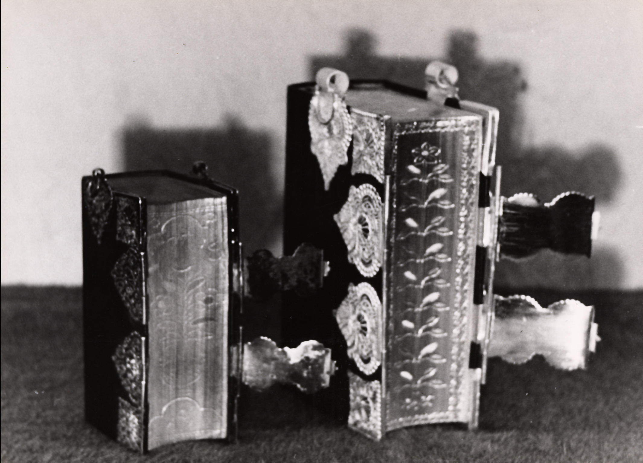 Twee kerkbijbels met zilverbeslag in Staphorst. De bijbels hebben allebei vier hoeken en twee krappen en bovenaan een beslagstuk met ring voor de draagketting of het draagkoord. De krappen zijn geopend, waardoor het patroon op de snede van de boeken zichtbaar is. De boeken en het zilver variëren in grootte.