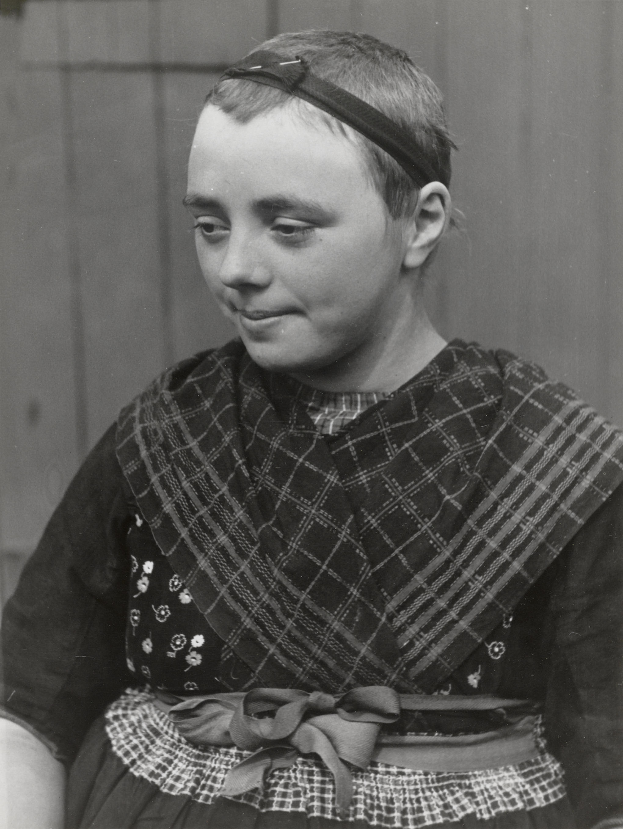 Beertje Veijer uit Rouveen in streekdracht. Ze heeft haar muts afgezet en toont haar kortgeknipte haar en strijklint. Beertje draagt de daagse dracht en is in de rouw.