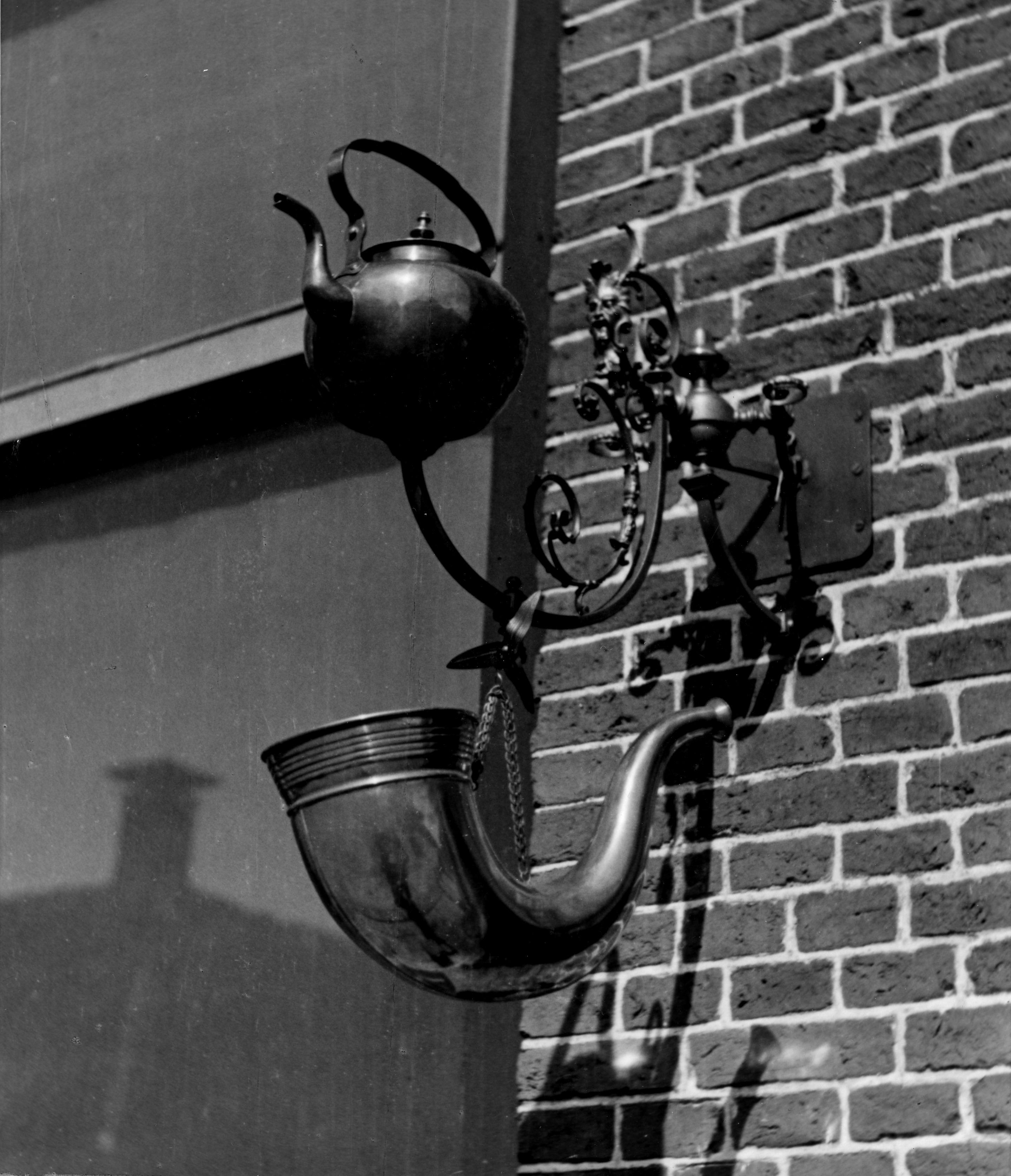 Uithangteken van een koperslager, Workum, 1944 (zwart-wit foto)