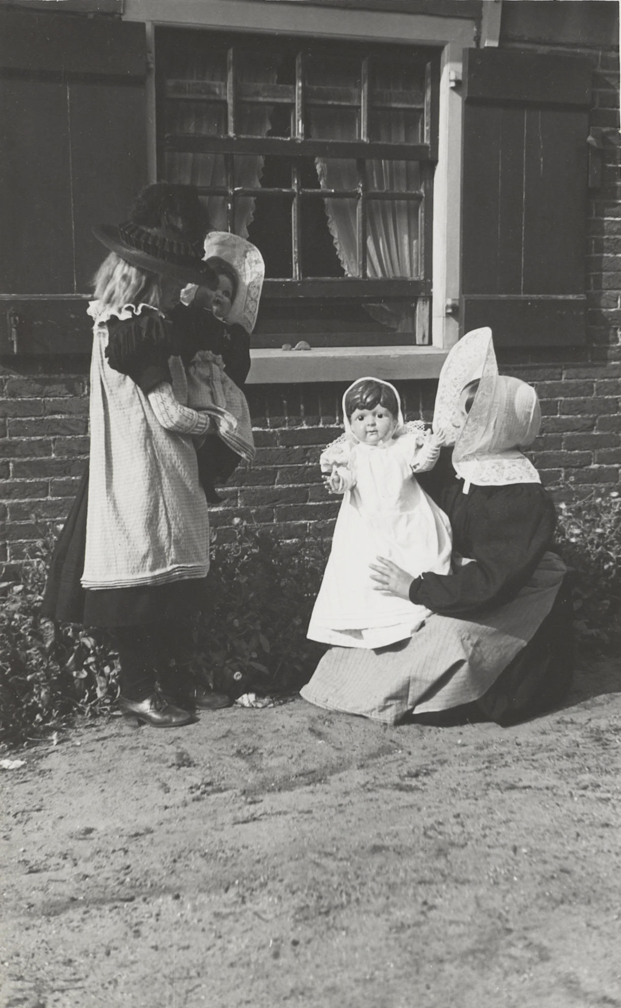 Meisjes en poppen in streekdracht, Huizen, 1945 (zwart-wit foto)