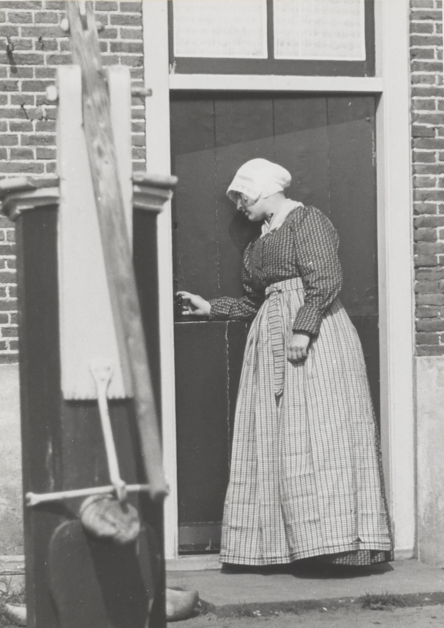 Vrouw verkleed in streekdracht, Huizen, 1945 (zwart-wit foto)