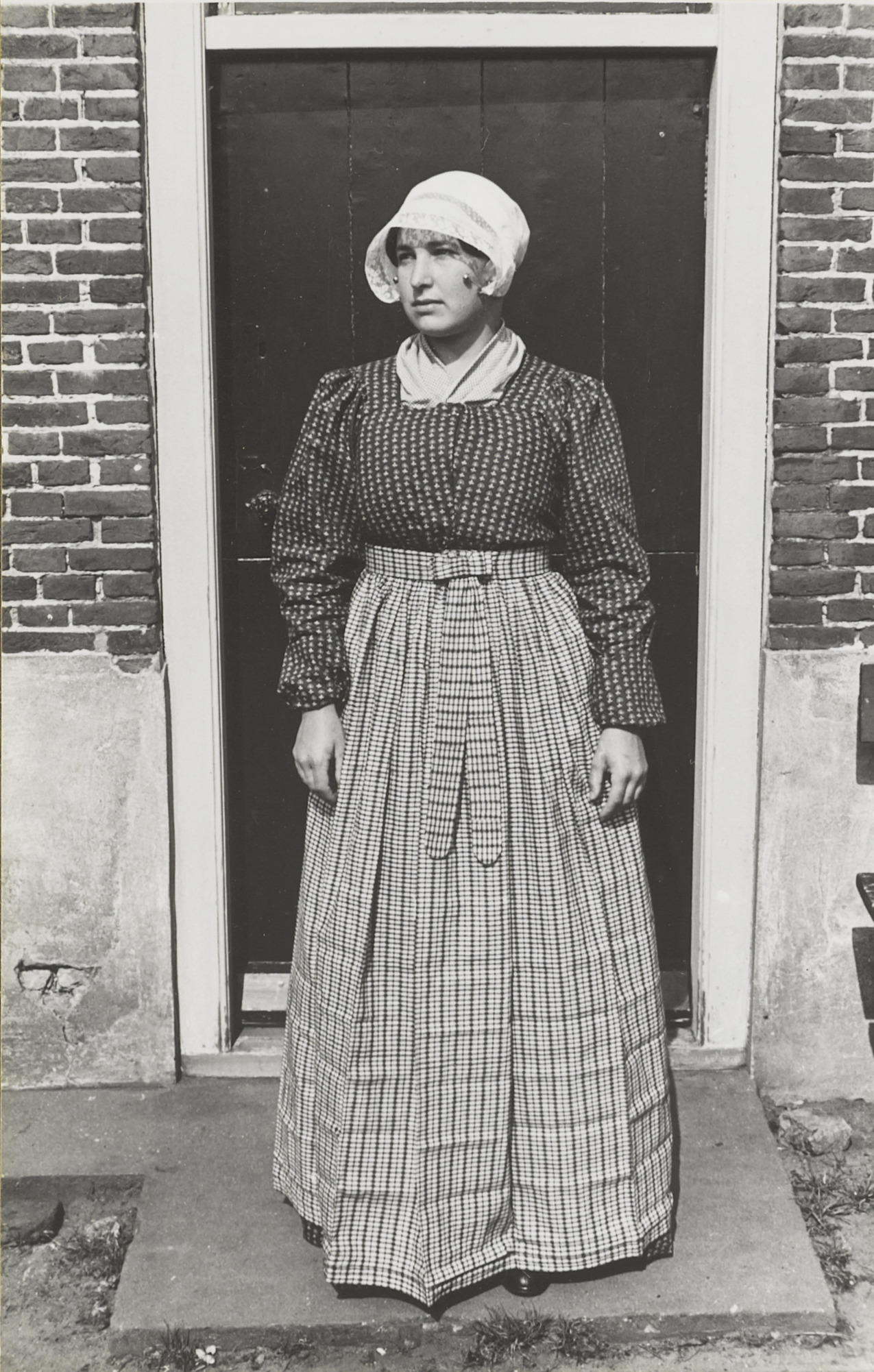 Vrouw verkleed in streekdracht, Huizen, 1945 (zwart-wit foto)