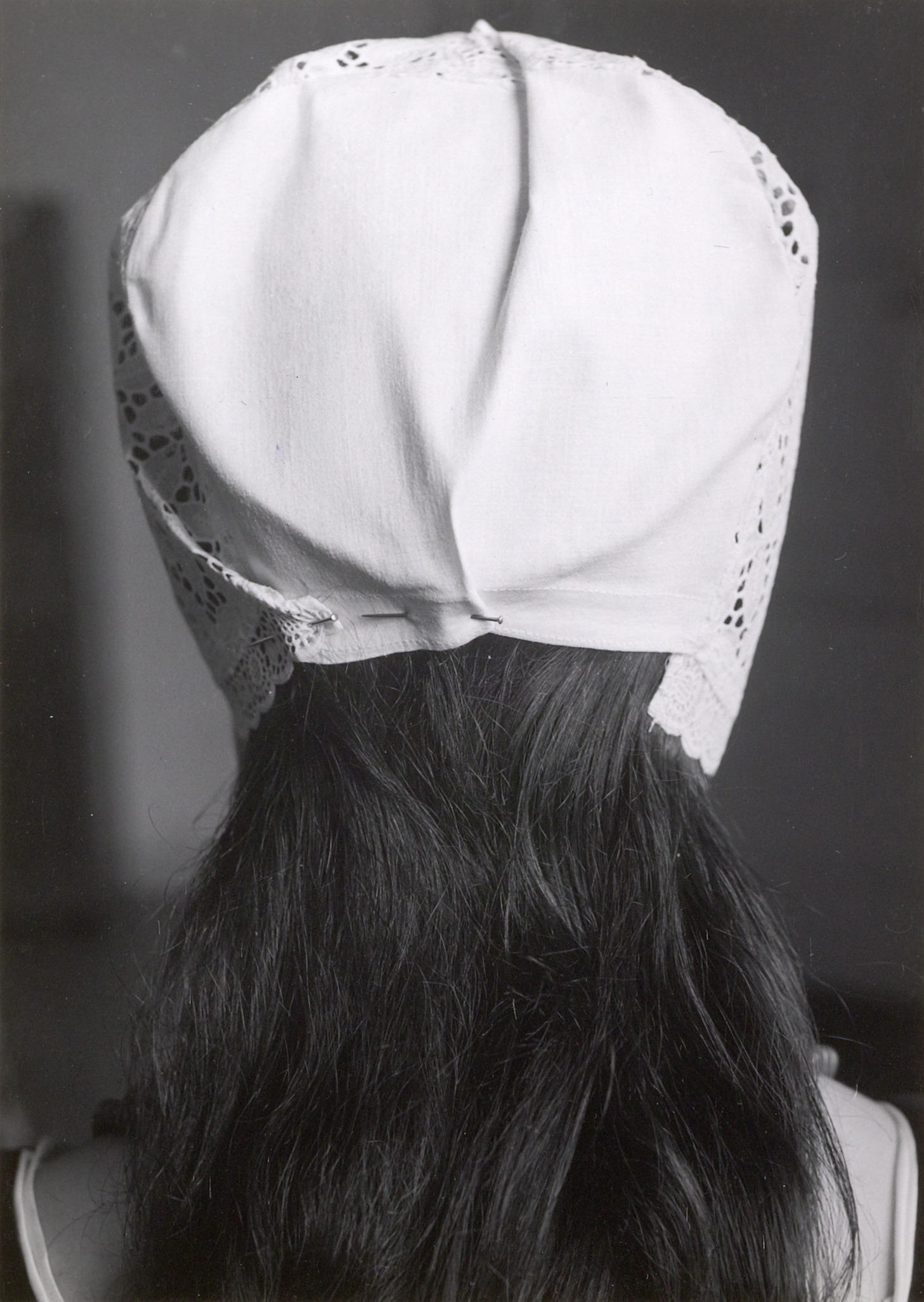 Kornelia Minderhoud uit Westkapelle demonstreert samen met haar moeder Willemina Minderhoud-Boogaard het 'kapzetten' van de Walcherse meisjesmuts, de zogenoemde lange muts. Aan de achterkant wordt de ondermuts op de juiste maat gespeld, te beginnen met een klein plooitje middenachter, vlak onder de oorijzerbeugel. Vervolgens wordt links een plooitje gelegd in het broderiegedeelte van de muts ...