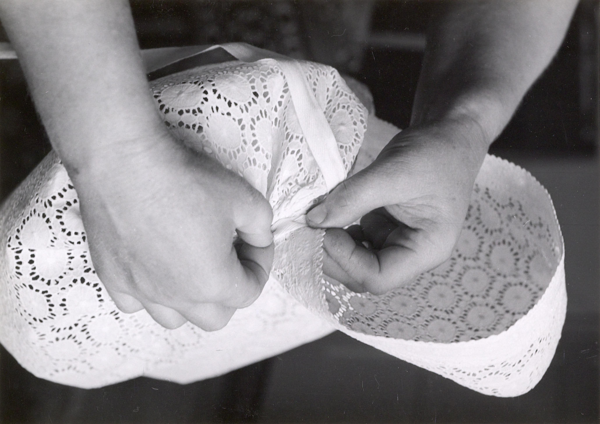 Kornelia Minderhoud uit Westkapelle demonstreert samen met haar moeder Willemina Minderhoud-Boogaard het 'kapzetten' van de Walcherse meisjesmuts, de zogenoemde lange muts. Willemina Minderhoud speldt de linkerkeelband op de linkervoorkant van de lange muts, tegen de aanzet van de achterstrook. Ook de rechterkeelband wordt op deze manier aan de muts bevestigd.