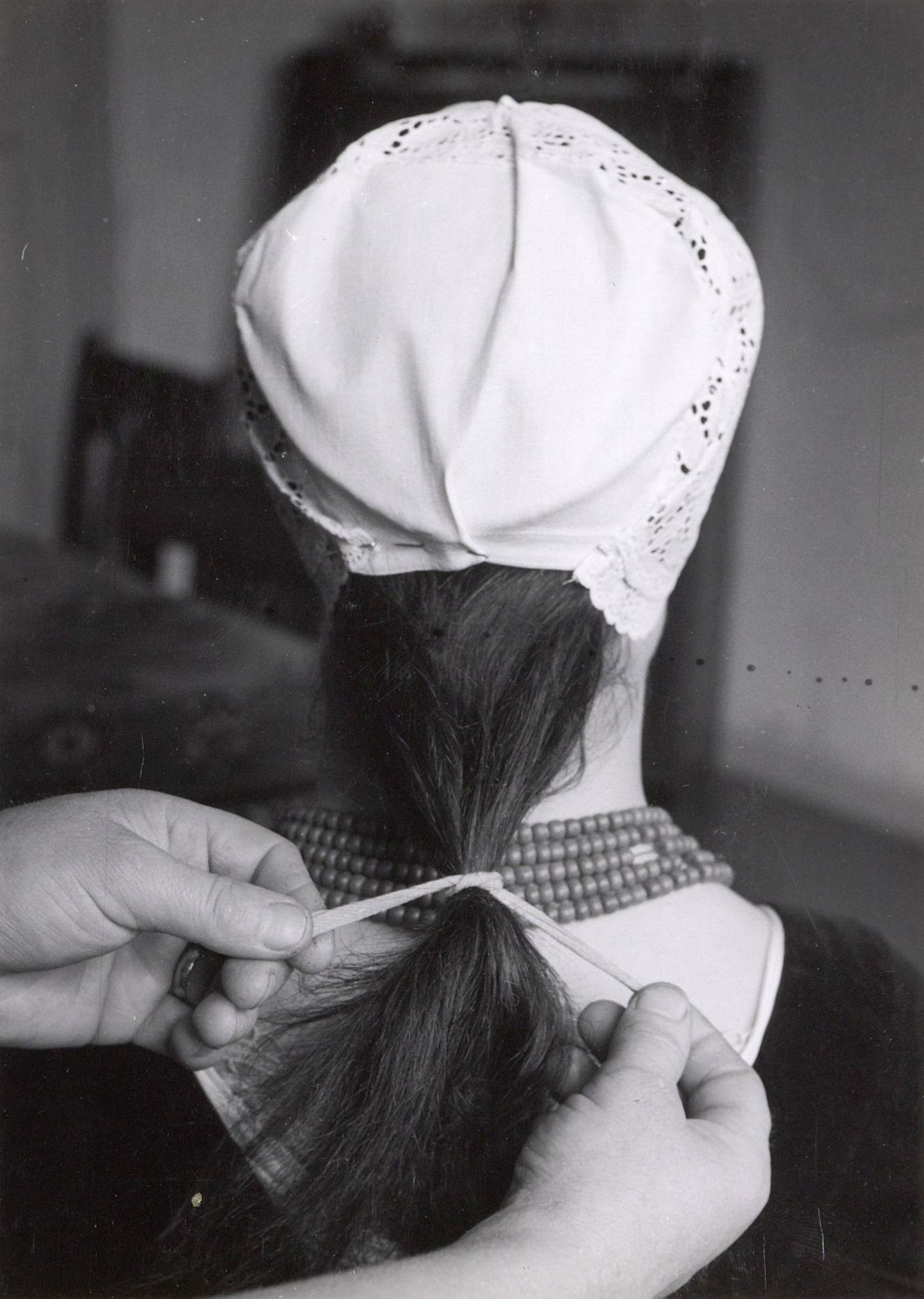 Kornelia Minderhoud uit Westkapelle demonstreert samen met haar moeder Willemina Minderhoud-Boogaard het 'kapzetten' van de Walcherse meisjesmuts, de zogenoemde lange muts. Aan de achterkant is de ondermuts op de juiste maat gespeld. De ondermuts zit dan aan de beide kanten glad over de zijkanten van het hoofd. Om het loshangende haar dat aan de achterkant ...