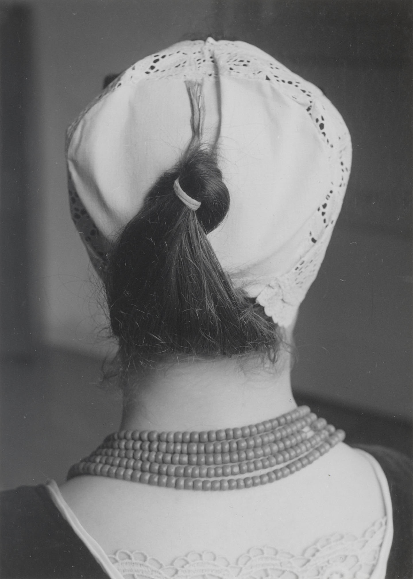 Kornelia Minderhoud uit Westkapelle demonstreert samen met haar moeder Willemina Minderhoud-Boogaard het 'kapzetten' van de Walcherse meisjesmuts, de zogenoemde lange muts. Aan de achterkant is de ondermuts op de juiste maat gespeld. De ondermuts zit dan aan de beide kanten glad over de zijkanten van het hoofd. Om het loshangende haar dat aan de achterkant ...